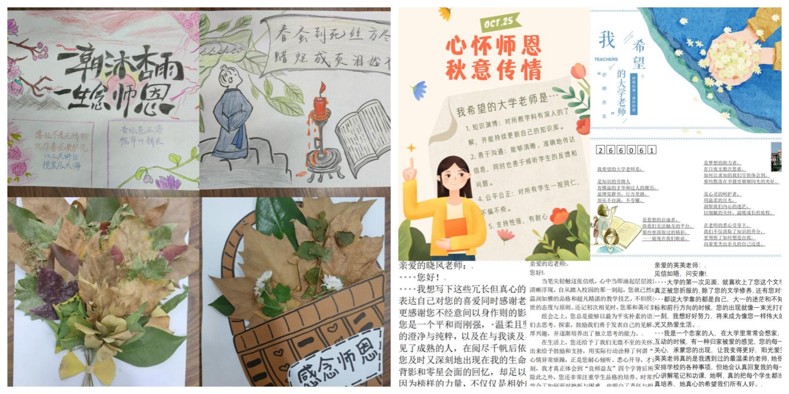 诗画相传、秋叶寄情。员工们通过线上线下投稿的形式,创作与老师相关的创意作品。绘画、秋叶手工艺品、明信片、信件等,无不展现了员工们对老师的深厚情感。