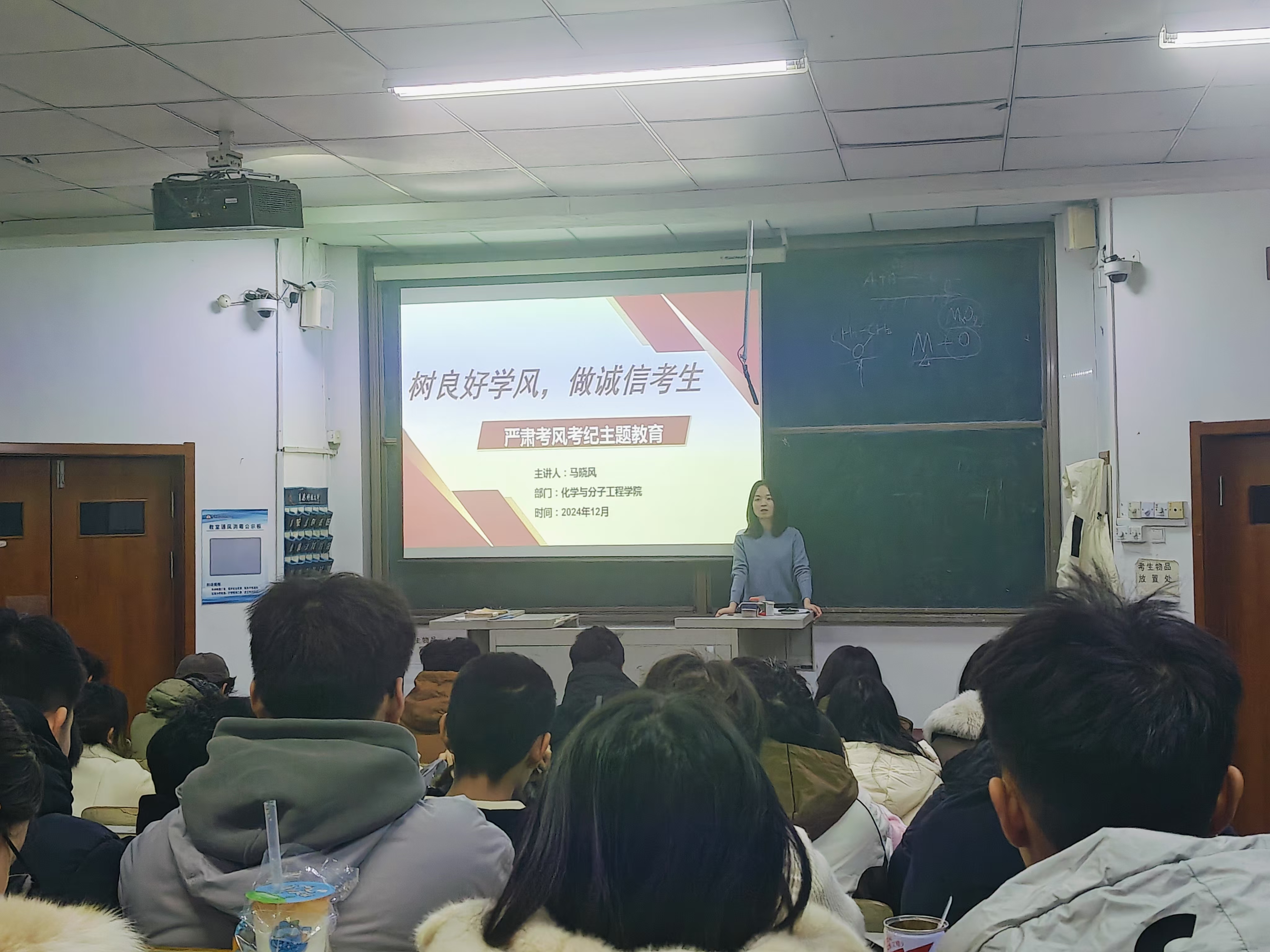 2024年12月10日,为进一步加强学风建设,倡导诚信考试,w66利来旗舰厅于第一教学楼102教室举办了“树良好学风,做诚信考生”严肃考风考纪主题教育大会。大会由马晓风老师主讲,22级全体同学参加。
