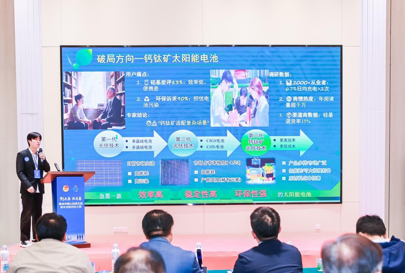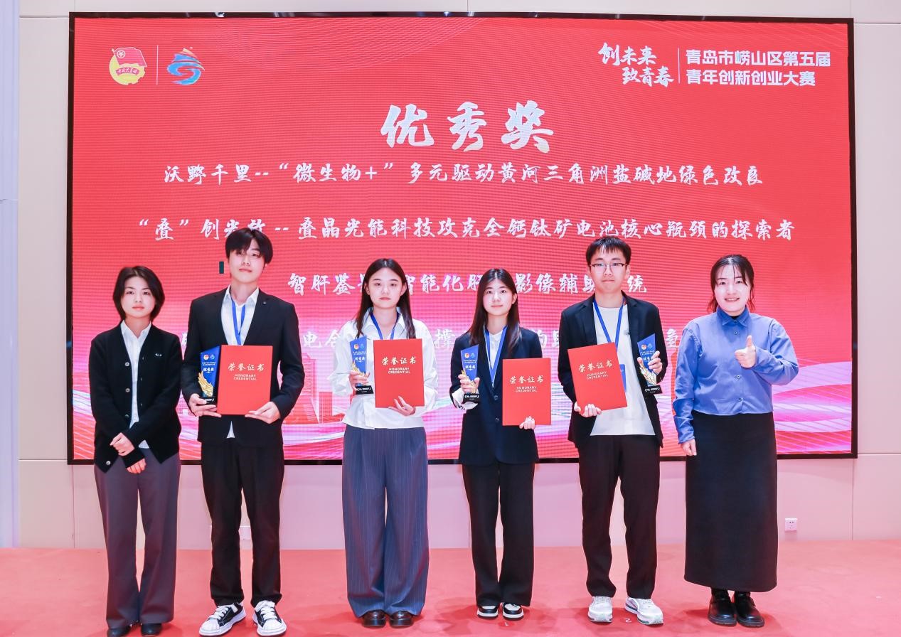 11月4日,青岛市崂山区第五届“创未来·致青春”青年创新创业大赛决赛圆满落幕。本次大赛在共青团青岛市委的指导下,由共青团崂山区委联合区委组织部、区科学技术局、区人力资源和社会保障局、区农业农村局、区卫生健康局共同主办,中国海洋大学团委、青岛大学团委及w66旗舰厅官网团委协办。公司本科生马林凭借其项目《“叠”创光效——叠晶光能科技攻克全钙钛矿电池核心瓶颈的探索者》,在激烈角逐中脱颖而出,荣获优秀奖。