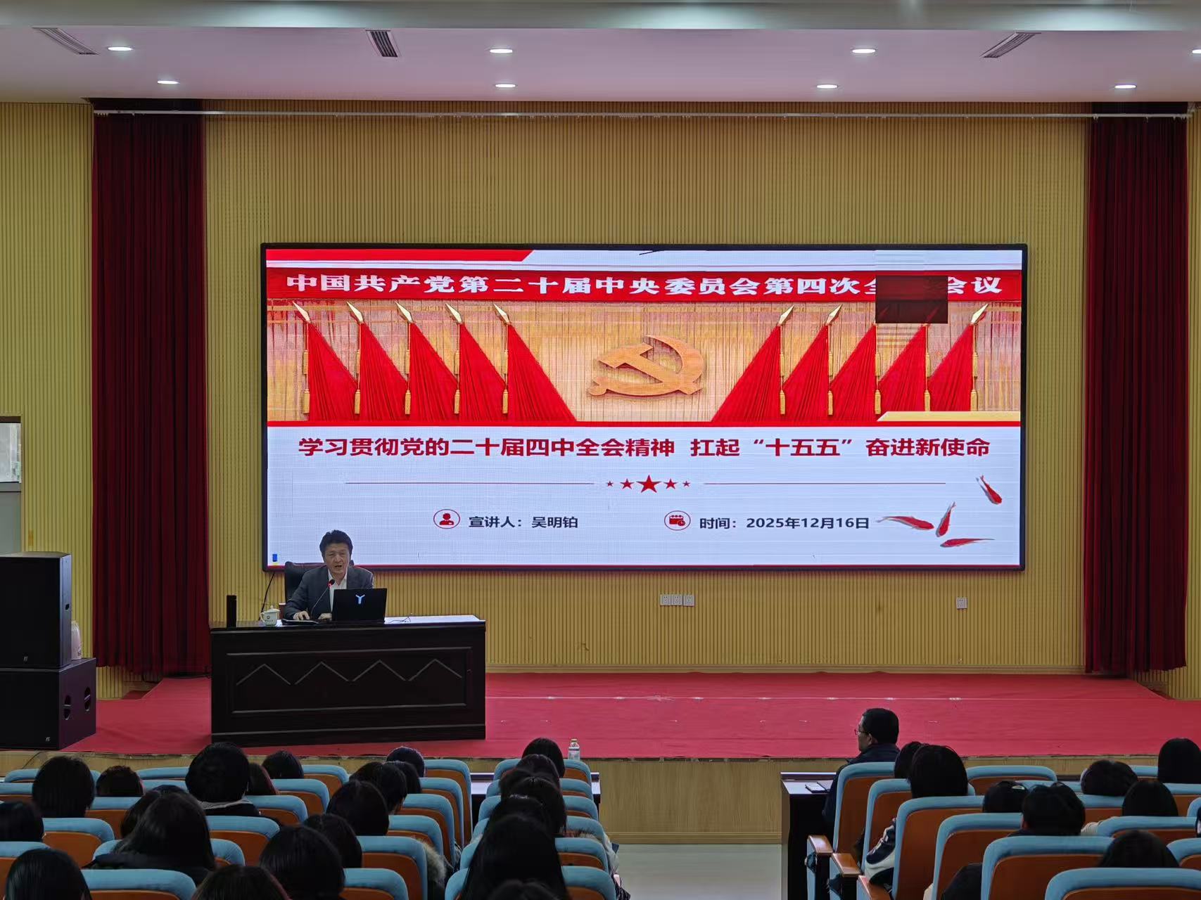 吴明铂以《学习贯彻党的二十届四中全会精神,扛起“十五五”奋进新使命》为主题,通过生动的案例、翔实的数据系统回顾了“十四五”时期我国经济社会发展取得的历史性成就,并对党的二十届四中全会的重要意义、《中共中央关于制定国民经济和社会发展第十五个五年规划的建议》擘画的未来五年发展蓝图、目标、原则与具体部署进行了详细的讲授。结合公司“十四五”发展成就及“十五五”规划,吴明铂重点总结了公司在团队建设、人才培养、科技创新等领域实现的突破性进展,详细介绍了公司“十五五”擘画的“1个总体规划+9个专项规划+2个特色规划+N个公司、部门、校区规划”的未来规划蓝图。他勉励员工要把握发展机遇,充分发挥化学、生物等基础学科的支撑与交叉融合优势,积极融入公司整体发展战略,培育创新发展新动能,在服务国家战略和公司发展中展现新担当、实现新作为。