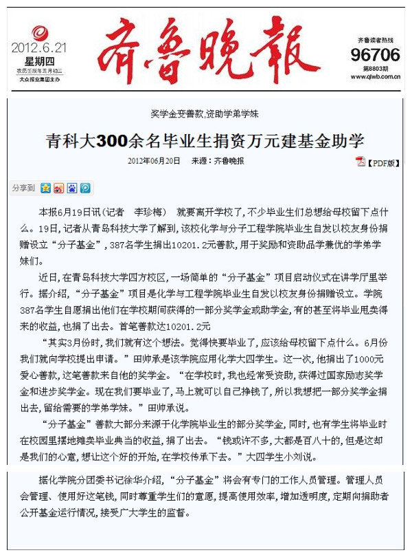 【齐鲁晚报】青科大300余名毕业生捐资万元建基金助学