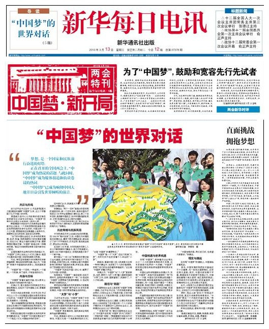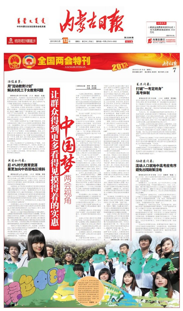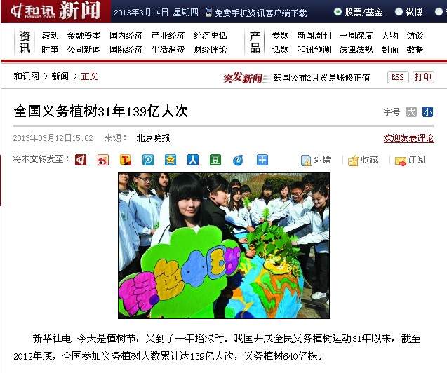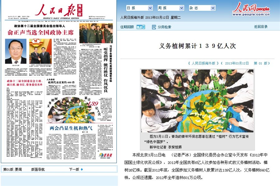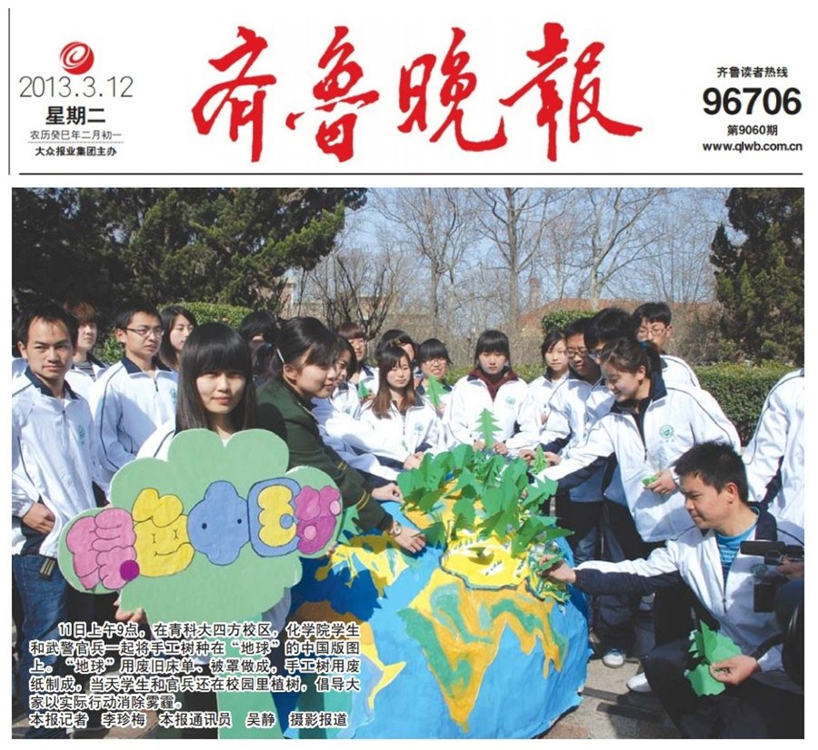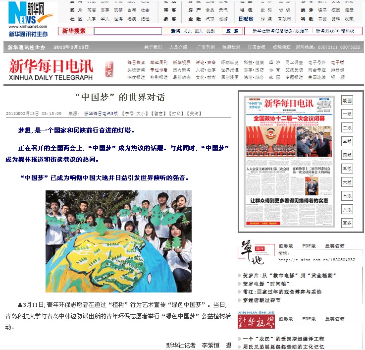w66利来旗舰厅员工和边防派出所警官用废旧的床单、被罩,手工做成圆形的地球,地球上突出了中国的版图,从不同省份的老员工和武警中遴选出来自全国各地的代表,共同制作手工树,并将“绿树”种植在自己的家乡版图上。手工树的地球被老员工和边防武警包围在中间,寓意在当前“中国梦”的大背景下,来自全国各地的老员工和边防武警代表,带着自己的梦想,立志在自己的家乡所在地,力所能及的植树造林,强化地球之肺,为祖国的绿色大好河山,贡献微薄之力。活动进行过程中,新华社记者李紫恒给予了积极评价,并用手中的相机记录了活动的整个过程,此外齐鲁晚报、半岛都市报、崂山区电视台现场报道了本次活动,海科112班范玲芳在接受采访中说道:老员工与边防武警还通过互联网向全国传递环保电子贺卡、发布植树海报,呼吁全社会参与植树,倡议大家以实际行动为消除“雾霾”、增进绿色环保而努力。1、《新华每日电讯》:中国梦的世界对话