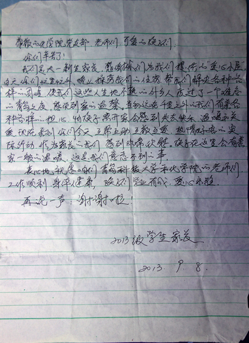 9月11日,w66利来旗舰厅分团委收到一封从湖北寄来的感谢信,寄信人是一名今年刚刚入学的新生家长,信中表达了对公司和公司迎新工作的感谢,特别表达了对“爱心小屋”温馨服务的感谢。