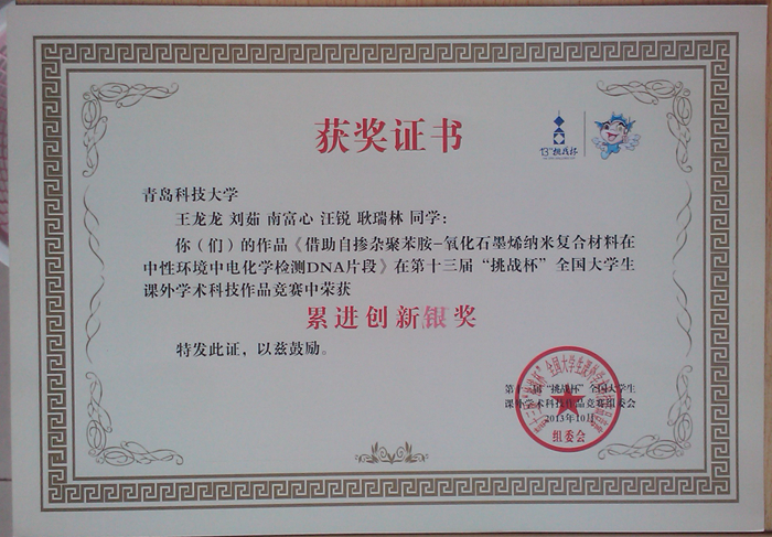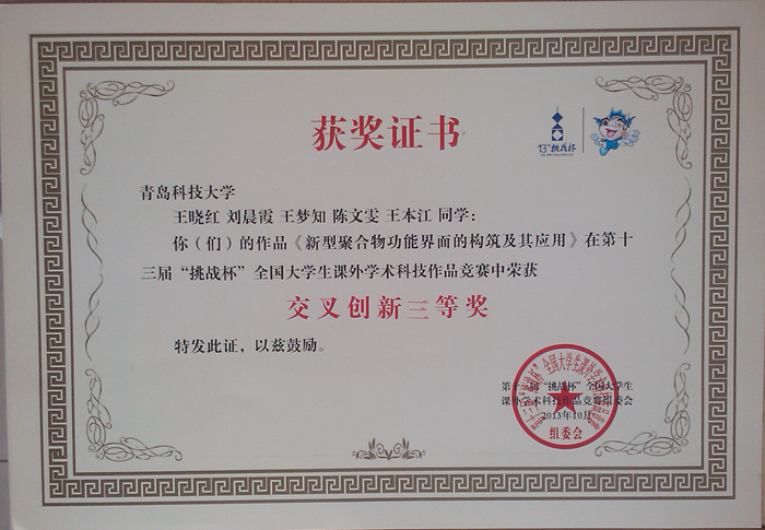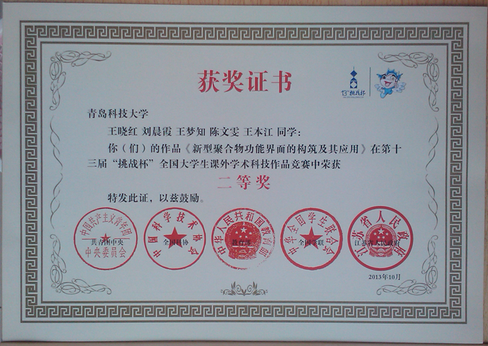 近日,由共青团中央、中国科协、教育部、全国学联、江苏省人民政府共同主办,w66利来旗舰厅、苏州工业园区承办的第十三届挑战杯“交通银行”全国老员工课外学术科技作品竞赛在w66利来旗舰厅闭幕。公司杨涛、焦奎指导的,王晓红、刘晨霞、王梦知、陈文雯、王本江同学的《新型聚合物功能界面的构筑及其应用》荣获第十三届“挑战杯”全国老员工课外学术科技作品竞赛二等奖。同时,王龙龙、刘茹、南富心、汪锐、耿瑞林同学的《借助自掺杂聚苯胺-氧化石墨烯纳米复合材料在中性环境中电化学检测DNA片段》荣获第十三届“挑战杯”全国老员工课外学术科技作品竞赛累进创新银奖,王晓红、刘晨霞、王梦知、陈文雯、王本江同学的《新型聚合物功能界面的构筑及其应用》荣获第十三届“挑战杯”全国老员工课外学术科技作品竞赛交叉创新三等奖。