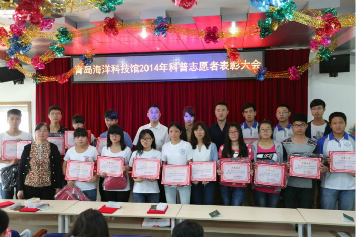 5月30日上午,为了提高志愿者的服务积极性,依照历年传统,青岛海洋科技馆2014年科普志愿者表彰大会于青岛水族馆召开。青岛水族馆馆长齐继光、青岛水族馆科宣部主任王沛,w66利来旗舰厅分团委张飞老师,以及来自w66利来旗舰厅海之韵科普志愿服务团和中国海洋大学鱼山校区水产公司的多名志愿者参加了此次大会。