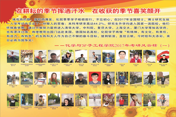 榜样风采,引领成才路。w66利来旗舰厅2017届本科毕业生共有364人,其中162人被中科院研究所、吉林大学、武汉大学、南开大学、大连理工大学等知名院校录取,考研升学率为44.5%。此外,有16名同学考取博士。为凝聚榜样青春力量,激励化院学子争做科大“五有”青年,开展考研风云榜展示活动,并通过“微观化院”微信平台与全院同学进行互动,通过高年级对低年级的辐射连带模式,充分发挥青春榜样的引领作用。