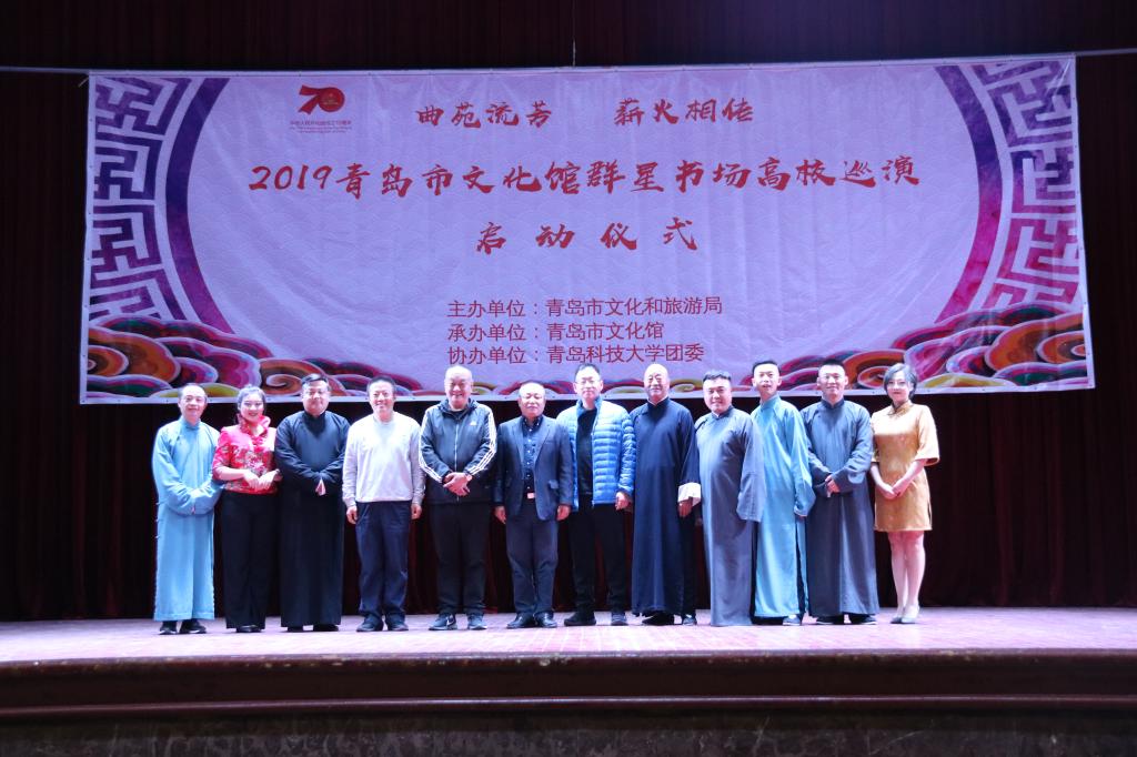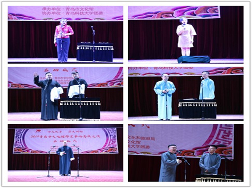 曲苑流芳,薪火相传。11月5日晚,由青岛市文化和旅游局主办,青岛市文化馆、w66旗舰厅官网团委、w66利来旗舰厅承办的“2019青岛市文化馆群星书场高校巡演启动仪式”在四方校区礼堂精彩上演。青岛市文化馆副馆长李国荣,青岛市文化馆活动部主任刘冰,青岛市相声艺术研究会主席朱琦出席启动仪式。四方校区各公司师生1200余人一起观看了演出。