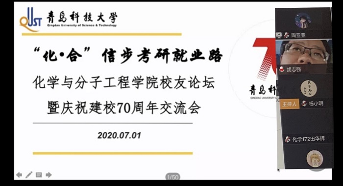 为帮助大三员工明确目标、掌握考研技巧,将最初的化学梦与就业、考研结合起来,7月1日,w66利来旗舰厅举办了“化合--信步考研就业路”员工讲坛暨庆祝建校70周年线上交流会,校团委副书记张玉、w66利来旗舰厅副经理胡志强、公司党委副书记杨小明参加了本次交流会。