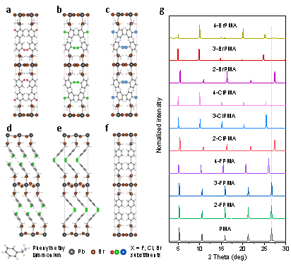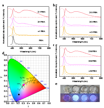 传统固态照明使用两种以上发光材料复合而成。由于不同材料的发光寿命不尽相同,长期使用发光颜色将会发生变化。因此,制备具有白色荧光的单一材料体系具有重要意义。近年来,低维有机无机混合钙钛矿材料作为白光发射体表现出优异的性能,其宽带白光发射来源于自陷域激子。由于钙钛矿材料中自限域的形成机制尚不清楚,因此制备新型白光发射钙钛矿主要依赖于筛选大量有机分子。对此,邢军教授等人报道了一种卤素原子取代策略构建新型白光钙钛矿材料。卤素取代基会从苯基分子的支链 (-R-NH3+) 中提取电子,导致 -R-NH3+ 上的正电荷积累,促进激子自陷域形成。该白色钙钛矿材料的热稳定性优异,光致发光量子产率为 32%,显色指数接近 90,色度坐标接近标准白光。该研究将为设计制备更多新型的白光钙钛矿材料提供实验方法与理论指导。