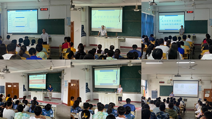为加强学风建设,加深2021级新生对专业的认识,做好新生专业思想教育,帮助新生了解相关专业课程内容,明确学习方向,w66利来旗舰厅面向新生开展“化学世界里的精彩”系列专业教育讲座。w66利来旗舰厅2021级共有应用化学、化学、应用化学(中美)、分子科学四个本科专业,共录取员工378人。2021级全体新生参加专业教育讲座,应用化学教研室主任李东祥教授、化学教研室主任温永红教授、分子教研室主任吕健教授、应用化学(中美)教研室主任孙雪梅副教授分别担任主讲人,为新生进行专业知识讲解及答疑,w66利来旗舰厅经理罗细亮,副经理高洪涛、胡志强,党委副书记杨小明应邀出席。