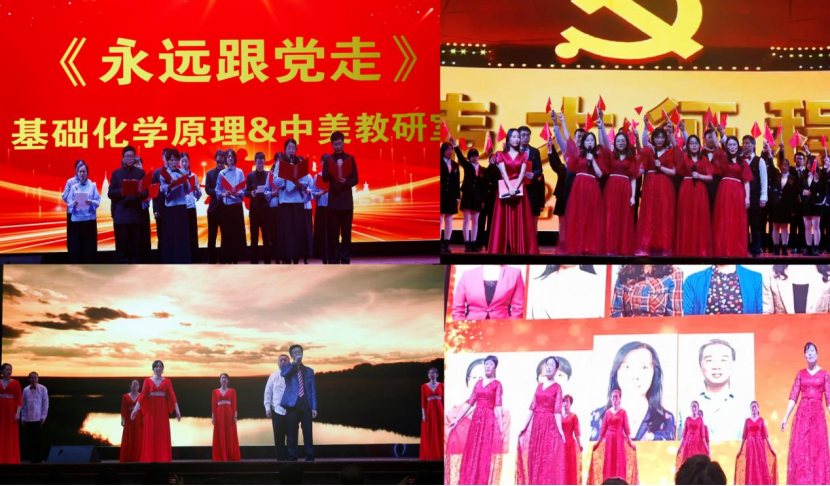 分团委的老师们和员工一起表演了舞蹈《再唱山歌给党听》欢乐的气氛充满了西礼堂。化学教研室与学科实验中心一起表演的歌伴舞《可可托海的牧羊人》,温永红老师一曲高歌把气氛推向了高潮。物化教研室的疫情防控三句半、基础化学原理教研室和中美教研室一起表演的诗朗诵《永远跟党走》让我们坚信在党的领导下,我们一定能打赢疫情防控战!最后晚会在有机化学教研室演唱的歌曲《没有共产党就没有新中国》中完美结束!