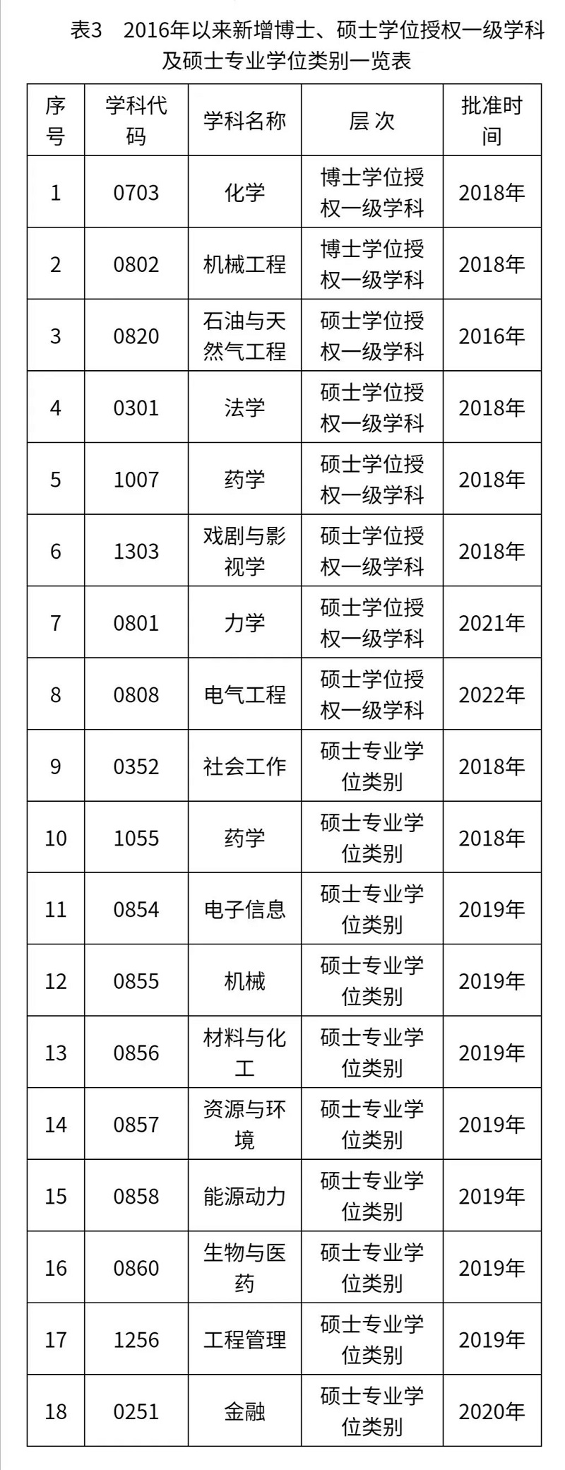 自2016年以来,公司获批化学、机械工程2个博士学位授权一级学科,法学、药学、戏剧与影视学、力学、电气工程5个硕士学位授权一级学科,社会工作、药学2个硕士专业学位类别。在工程硕士专业学位授权点对应调整工作中,将12个工程领域调整成电子信息、机械、材料与化工、资源与环境、能源动力、生物与医药、工程管理7个专业学位类别。公司坚持“有所不为”原则,主动撤销发展前景不好的精密仪器及机械、情报学2个硕士学位授权点,对应调整增列石油与天然气工程、金融2个硕士学位授权点(表3)。截至目前,公司共有5个博士学位授权一级学科,24个硕士学位授权一级学科,16个硕士专业学位类别,实现了各教学公司硕士一级学科授权点全覆盖。