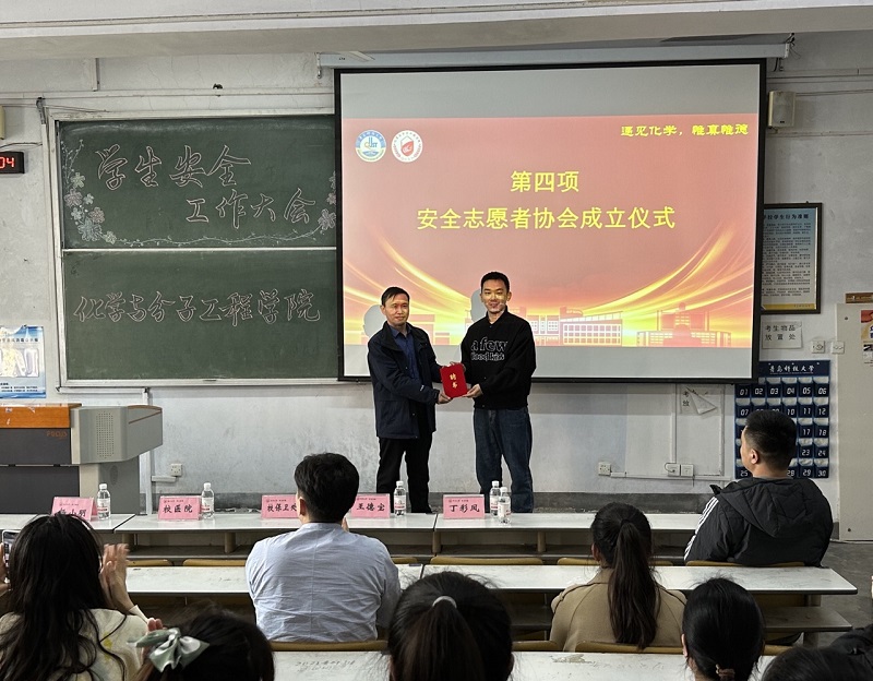 王德宝向w66利来旗舰厅安全志愿协会志愿者代表颁发聘书并讲话。王德宝指出:安全工作压倒一切,没有安全没有一切,班长团支书要牢固树立、带头践行总体安全理念。安全志愿者代表吴琼唯代表全体志愿者发言,安全志愿者代表王磊宣读了《w66利来旗舰厅校园安全倡议书》。会上还观看了实验室安全、校园安全的视频纪录片。