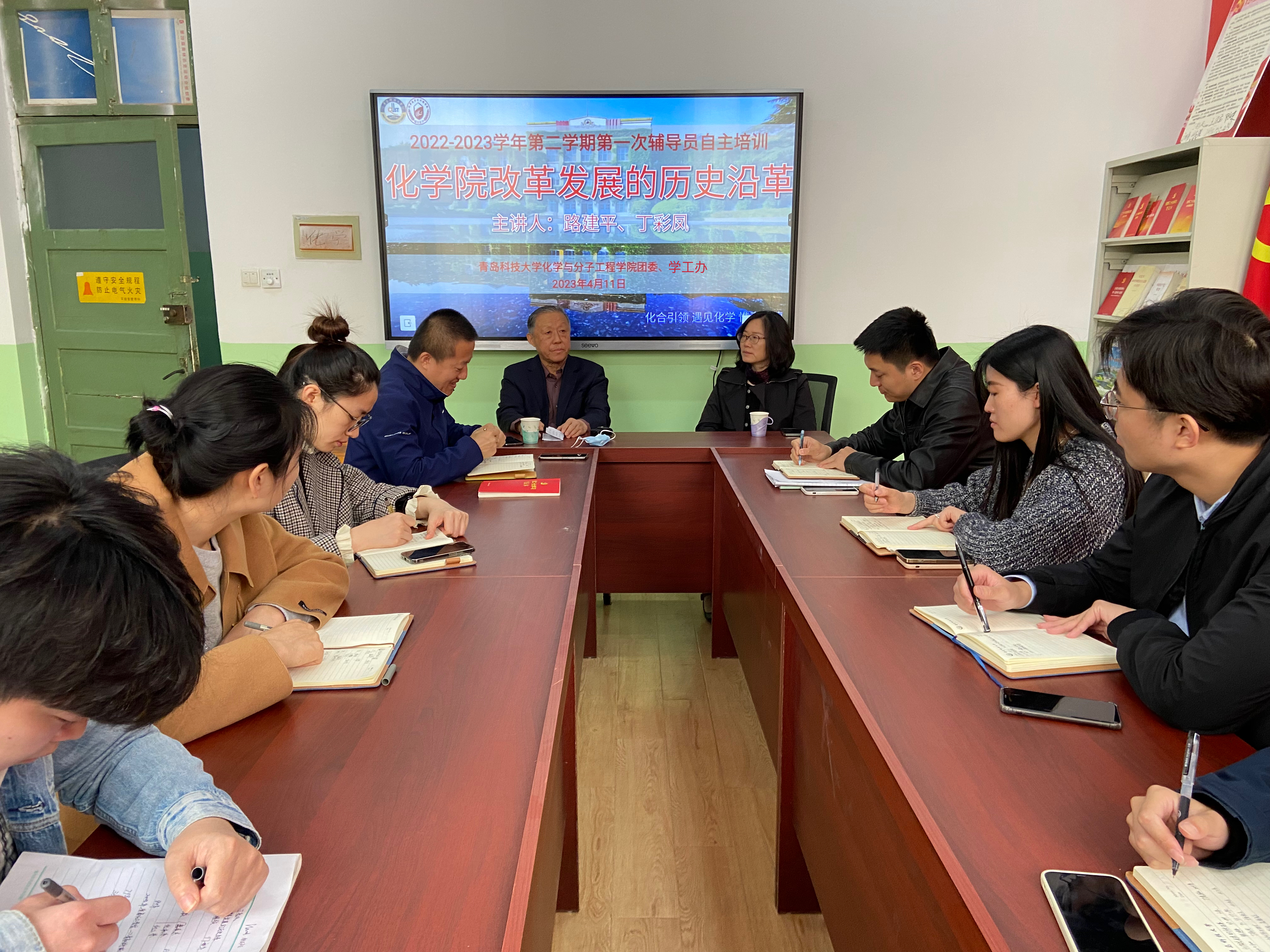4月11日,w66利来旗舰厅2022-2023学年第二学期第一次辅导员自主培训在公司党建活动室举办。原公司党总支书记路建平、光电传感与生命分析教育部重点实验室执行主任丁彩凤以“w66利来旗舰厅改革发展的历史沿革”为题,为w66利来旗舰厅全体专兼职辅导员上了一堂生动而有意义的思政大课、人生大课。