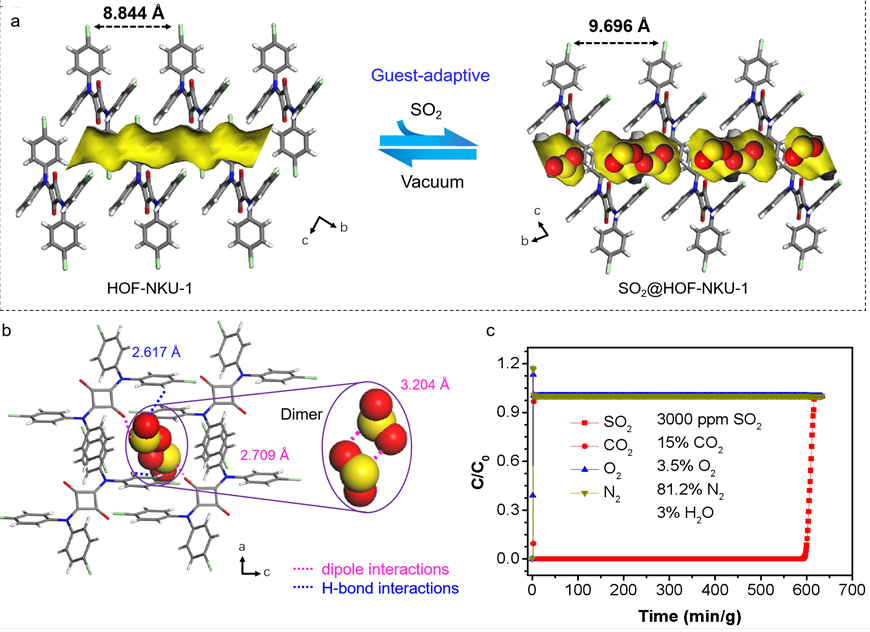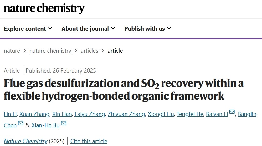 2025年2月26日,南开大学材料科学与工程公司卜显和院士/李柏延特聘研究员团队联合浙江师范大学/福建师范大学陈邦林院士团队在国际顶级学术期刊《Nature Chemistry》上发表题为“Flue Gas Desulfurization and SO2 Recovery within a Flexible Hydrogen-Bonded Organic Framework”的研究性文章。该研究提出一种自适应柔性氢键有机框架材料设计的新方法,此方法首次开发了一种兼具形状记忆和自适应孔道的疏水氢键有机框架材料,以解决在实际高湿度烟道气中选择性吸附二氧化硫(SO2)的难题,并通过解析负载SO2的单晶结构解释了分子层面的作用机理,对于进一步开发和拓展具有特异性高效气体吸附分离材料提供了新思路。