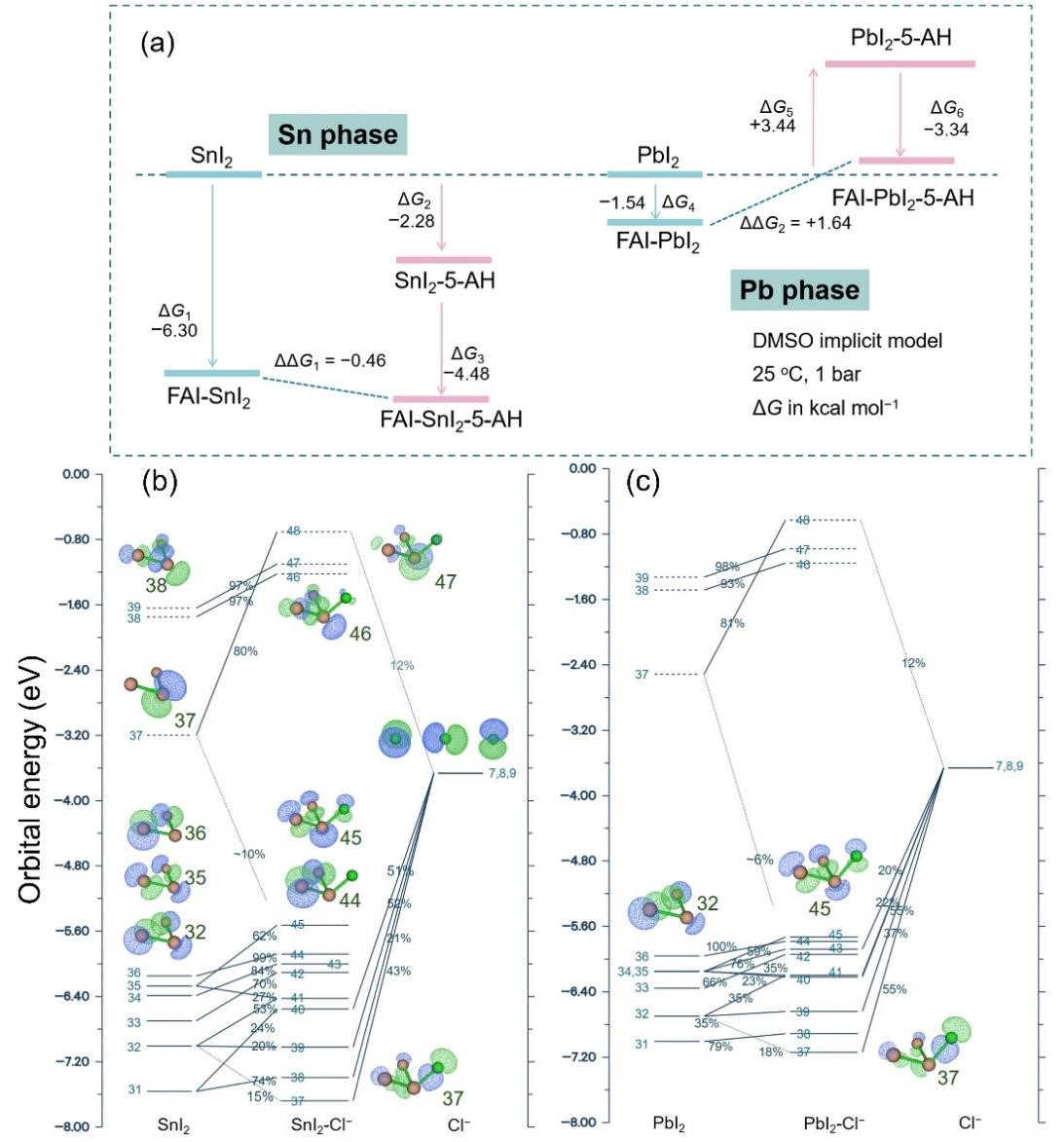 周忠敏团队分析了钙钛矿前驱体溶液中竞争反应的吉布斯自由能以及分子轨道相互作用,揭示了选择性配位机制,通过引入分子5-AH,选择性地与SnI2配位,形成热力学上有利的SnI2-5-AH加合物,从而延迟了Sn基钙钛矿的结晶。这种结晶调节提高了成分均匀性和结晶质量,从而有效地抑制了非辐射复合。此外,Sn2+和5-AH之间的强相互作用以及更少的晶界抑制了Sn2+的氧化。钙钛矿的结晶在注入反溶剂后开始。因此,在环境条件下研究钙钛矿前驱体溶液中溶质之间的相互作用过程是必要的。在图1中,对于左侧所示的“Sn相”,在FAI和SnI2一步生成FAI-SnI2(FASnI3的单元)的过程中释放出相当大的吉布斯自由能(ΔG1)。当引入5-AH分子时,可以先形成SnI2-5-AH加合物(ΔG2),然后再与FAI(ΔG3)结合。与原始的FASnI3形成(ΔΔG1<0)过程相比,这个过程在热力学上更有利,并且稳定了Sn基钙钛矿组分,从而降低了缺陷密度和对氧的亲和力。此外,较温和的相互作用(|ΔG3| < |ΔG1|)有助于延缓和调节结晶。相反,在“Pb相”中,与ΔG1相比,FAI-PbI2的形成仅导致微小的吉布斯自由能下降(ΔG4),这表明Sn基钙钛矿的结晶往往比Pb基的结晶发生得更快。通过计算还发现,加合物PbI2-5-AH在DMSO连续介质中是不利的(ΔG5)。虽然PbI2-5-AH和FAI之间的结合在理论上也是自发的(ΔG6),但是该复合物不能稳定FAPbI3组分(ΔΔG2 > 0)。因此,5-AH在Sn-Pb合金前驱体溶液中显示出对SnI2的热力学选择性,并减少了Sn和Pb物种结晶速率的失配。