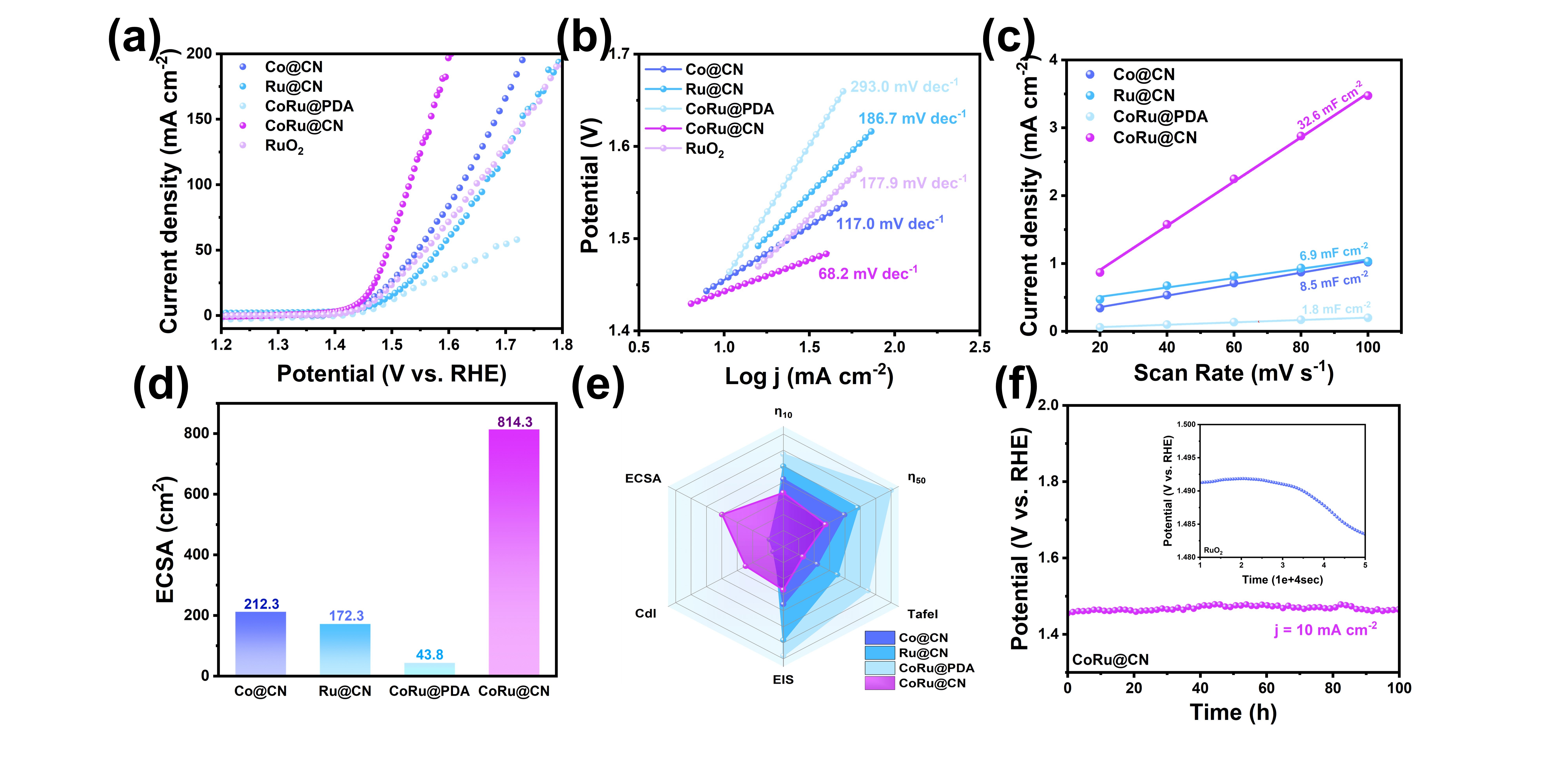 图2. Co@CN、Ru@CN、CoRu@PDA、CoRu@CN及RuO2的CER性能。 (a) LSV曲线, (b) 塔菲尔图, (c) Cdl曲线, (d) ECSA值, (e) CER性能综合对比, (f) i-t稳定性测试。
