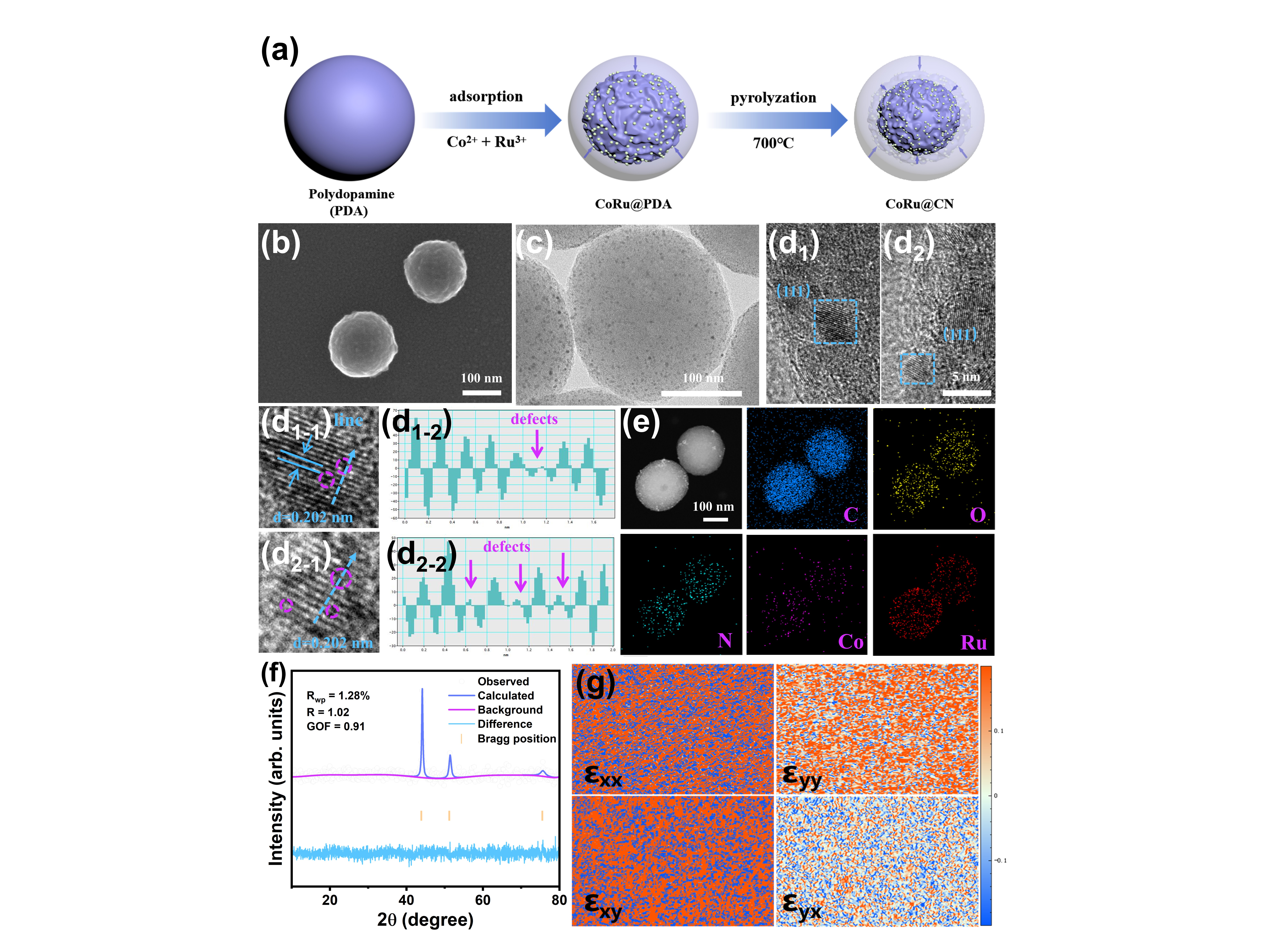 针对该问题,化学实验221班本科生张琪琪同学自大二以来加入w66利来旗舰厅王磊、肖振宇老师课题组进行科研攻关,采用创新策略在聚多巴胺纳米球表面吸附Co²⁺和Ru³⁺,再对其进行高温煅烧,制备了CoRu@CN催化剂(图1)。