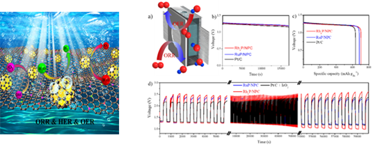 该团队建立于2017年6月,研究方向为光电催化能源器件关键反应,例如HER,OER和ORR, 以及其他小分子活化。该团队制备的低负载贵金属电催化剂,铑和钌的含量分别为0.4 wt% 和 0.5 wt%,催化剂表现了优异的三功能性能,尤其是氧气还原和氢气析出反应,按照质量活度计算,铑和钌催化剂的性能分别是铂碳50~100倍。此两种电催化剂组装的锌-空电池和水裂解池,性能优于贵金属Pt/C 和 IrO2组装的电池,有潜在规模化应用前景。该成果为替代传统高活性贵金属电催化剂,减少贵金属用量开辟了新的途径。