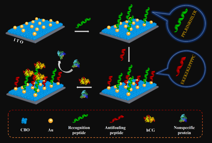 该肽基传感器的显著特征是,在光阴极上同时修饰有识别多肽和防污多肽。识别多肽序列为PPLRINRHILTR,它与人绒毛膜促性腺激素(hCG)具有较强的特异性亲和力。与传统的抗体识别探针相比,短链的多肽识别探针空间位阻小,有效减少了光阴极的电流输出损失。防污多肽序列为EKEKEKEPPPPC,所形成的防污界面对非特异性生物大分子具有良好的抗吸附性能。与BSA等传统的封闭试剂相比,防污多肽空间位阻小、表面阻断性能强。基于光阴极明显的电流输出,结合识别多肽与防污多肽的优异特性,所构建的肽基阴极光电化学疾病标志物传感器能够在复杂生物基质中实现对目标物的高灵敏、精准检测。