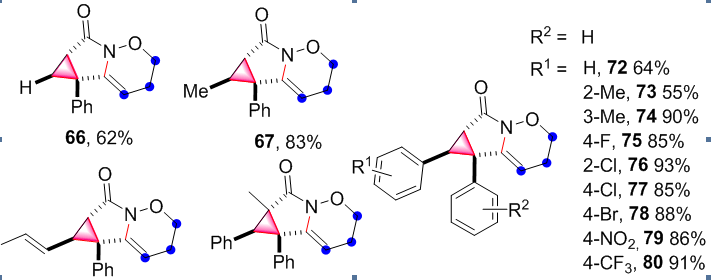 芳环去芳构化反应一直是有机化学研究的热点课题,过去几十年,吲哚的去芳构化反应取得了长足的进展,而简单苯环的去芳构化反应研究甚少,一般是由Buchner反应实现,即铑催化剂下,苯环与重氮化合物发生去芳构化反应得到环庚三烯化合物。但是昂贵的铑催化剂增加了反应成本,同时重氮化合物具有易爆的特性,此类反应也极具危险性。近期报道了一种高碘化合物促进的由芳基酰胺构建环庚三烯的新方法(图1)。该方法无需金属催化剂,底物制备简便,官能团普适性良好,条件温和,反应迅速(1分钟之内便可完成反应)。最高产率可达99%。这是第一例无金属促进的构建环庚三烯化合物的方法,拓展了芳环去芳构化的研究,同时也为制备具有药物活性的骨架分子奠定了基础。不仅如此,以烯酰胺为反应底物,此反应可得到稠环丙烷类多环化合物,进一步拓展了环丙烷类化合物的合成方法(图2)。