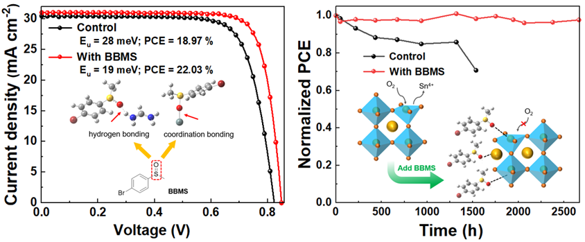 本文使用了具有还原性和富电性的1-溴-4-(甲基亚磺酰基)苯(BBMS)作为添加剂,通过S = O与Sn-Pb合金钙钛矿之间的氢键作用和配位作用抑制Sn2+的氧化、延迟结晶速率从而有效调节薄膜能量紊乱,降低开路电压(VOC)损失,提高Sn-Pb合金PSC的效率和稳定性。
