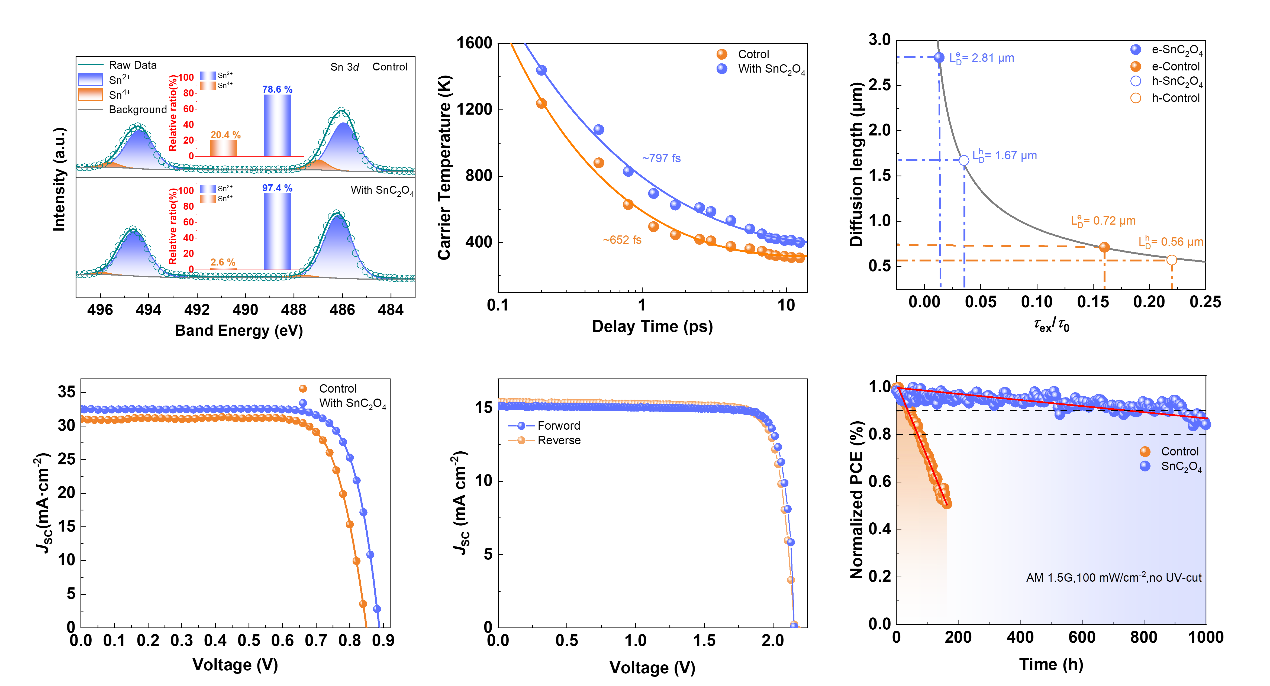 w66利来旗舰厅周忠敏团队与合作者报道了将草酸锡(SnC2O4)引入锡铅钙钛矿前驱体溶液中以调节热载流子冷却动力学。SnC2O4的添加增加了载流子扩散的长度,延长了载流子的寿命,同时减缓了载流子的冷却速度。此外,SnC2O4可以与不配位的Sn2+和Pb2+离子结合,调节钙钛矿的结晶并实现大晶粒。C2O42-的强还原性可以抑制Sn2+氧化成Sn4+,并最大限度地减少所得钙钛矿薄膜中Sn空位的形成。此外,作为氟化锡(II)的替代品,SnC2O4的引入避免了由于F-离子在界面聚集而引起的载流子传输问题。