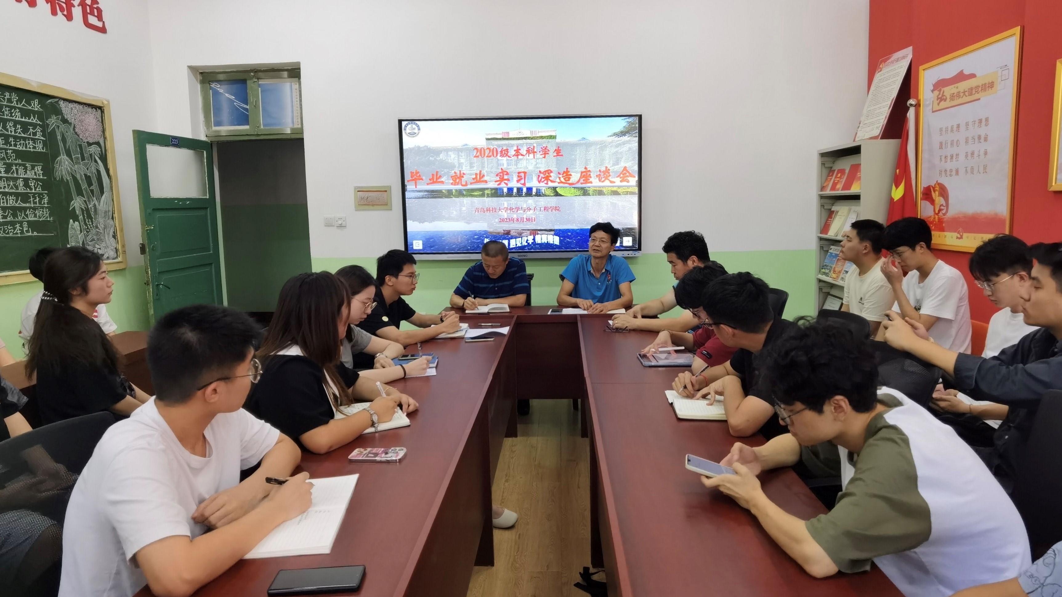 杨小明首先介绍了当前化学化工、新能源新材料领域就业市场的变化和趋势,化工产业园区建设的区域选择和发展前景,希望同学们下好先手棋,关注市场动态,了解行业趋势,把握发展机会,负责任的做出符合国家利益、自身发展和市场需求的最优选择。同学们作为班级员工骨干,首先要明大势,顺势而为,做好师生沟通的桥梁和纽带,把国家、省市、公司的毕业生环节的政策、措施准确传达到每位毕业生同学。其次要明底数,奋发有为,了解同学们本科直接就业的同学到底有哪些?是不是已经制作了高质量的求职简历?希望继续深造的、并且落实到行动的同学到底有哪些?还有哪些同学在毕业环节可能会遇到学分不够等情况的同学有哪些?最后要明政策,积极作为,务必吃透就业政策、推免政策、毕业要求等,提高服务同学的能力水平,工作中坚决杜绝随波逐流,要牢牢把握事情本来的是非曲直。