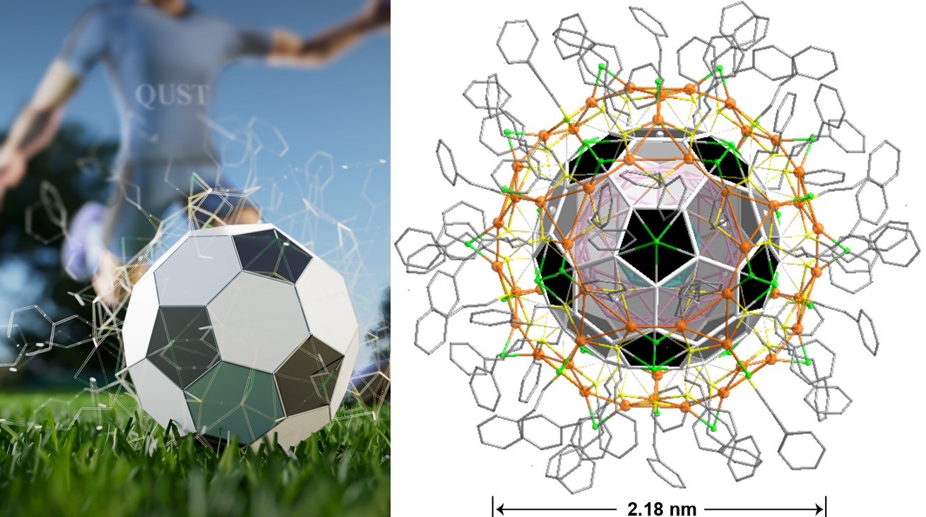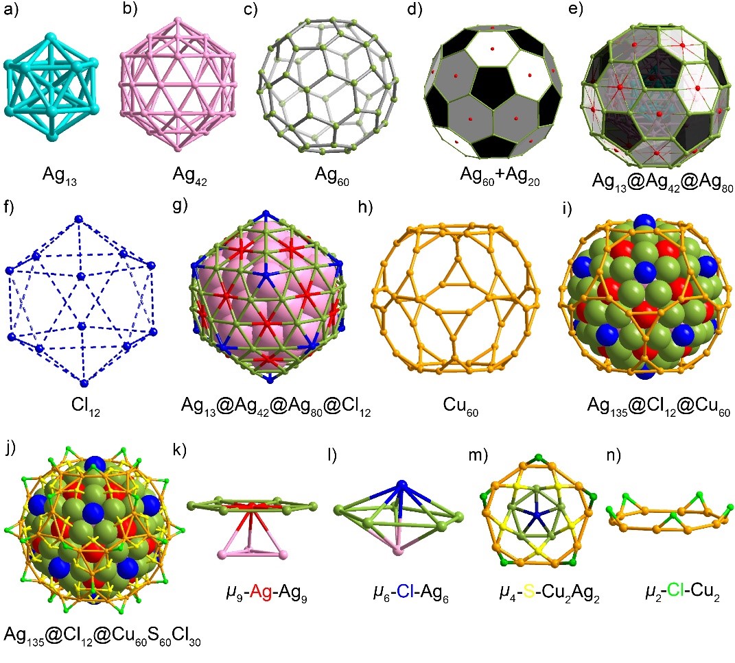 近日,公司汪恕欣教授团队报道了迄今为止最大的具有确定结构的Ag-Cu合金纳米团簇—Ag135Cu60(S(CH2)2Ph)60Cl42(以下简称Ag135Cu60),该纳米团簇具有一个世界上最小的Ag质足球形内核(图1),并且兼具分子和金属状态。相关成果以“Structure and optical properties of an Ag135Cu60 nanocluster incorporating an Ag135 buckminsterfullerene-like topology”为题,于2025年1月14日在线发表于Nature Synthesis期刊。