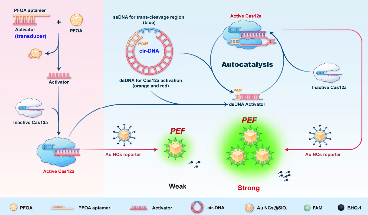 传统CRISPR/Cas12a分子诊断平台在检测非核酸目标(如蛋白质、小分子污染物)时,由于目标物无法像核酸一样进行预扩增,导致灵敏度严重受限。研究团队设计了信号转换器并创新性地引入了一种cir-DNA结构,该结构同时包含可被Cas12a切割的单链区域和能够激活Cas12a的双链区域。当目标物存在时,释放的单链DNA(ssDNA)激活器激活初始的Cas12a活性,随后切割cir-DNA并将其转化为线性双链DNA激活器,新生成的线性双链DNA激活器又能激活更多的Cas12a,形成“激活-切割-再激活”的自催化循环,从而产生级联信号放大效应(图1)。