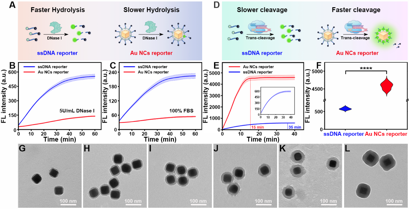 针对荧光染料光漂白导致的灵敏度不足问题以及CRISPR/Cas 12a与传统ssDNA报告子之间随机碰撞导致的切割反应动力学速率低、稳定性差等问题,作者合成了金纳米立方体(Au NCs)并选择其作为空间限制效应和PEF基底,制备了Au NCs报告子(图2)。与传统ssDNA报告子相比,Au NCs报告子具有更快的反应动力学,反应时间缩短至15min,荧光强度提高了近7.8倍。此外,由于球形核酸设计,Au NCs报告子对核酸酶(如DNase I)以及FBS的抗降解能力也得到了提升(图3)。