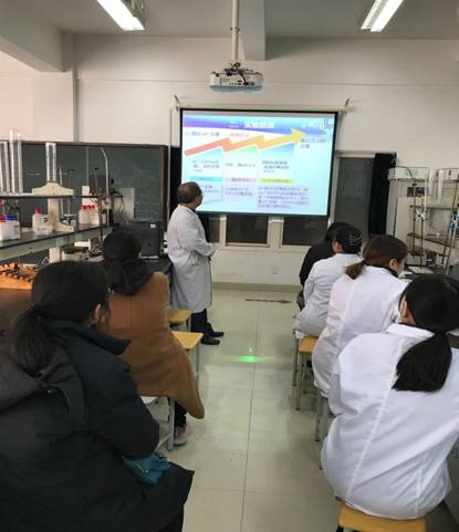 会后由实验中心主任罗世忠老师对“胃舒平药片中铝和镁的测定”实验进行了示范教学。罗世忠老师从实验目的,实验原理,实验操作及注意事项等方面,详细讲解“胃舒平药片中铝和镁的测定”实验。对该实验中涉及的配位剂(EDTA),从其结构和与金属元素的配位原理等方面进行重点讲解;重温滴定方式,包括:直接滴定,间接滴定,置换滴定和返滴定,强调该实验中采用返滴定法滴定Al3+,并解释采用返滴定法的原因,包括Al3+能使指示剂封闭,Al3+与EDTA的反应慢,以及Al3+在最低pH下水解;同时强调该实验中要严格控制pH值,以及pH值对该实验的影响。