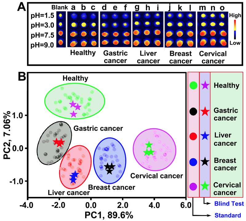 为了解决这一问题,本科三年级丁稼祥、石加衡同学自大二暑假开始进入w66利来旗舰厅徐升豪、罗细亮教授课题组进行科研攻关,开发了一种pH值编程的荧光传感阵列(图1),实现了健康人与胃癌、肝癌、乳腺癌以及直肠癌病人血浆的直接鉴定区分(图2)。同时,15例未知癌症血浆样本也被准确地被鉴定区分,该工作为癌症等重大疾病的早期筛查提供了快速、简便且有效的新方法。