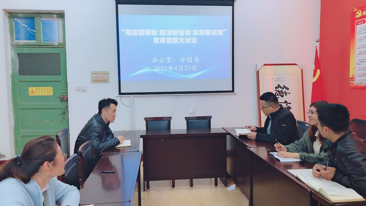 4月23日下午,办公室与分团委在党员活动室开展“顺应新形势 瞄准新目标 实现新突破”教育思想大讨论。各位老师结合近期工作,对自己工作中遇到的难点问题进行梳理,并分享了自己的建议和心得。