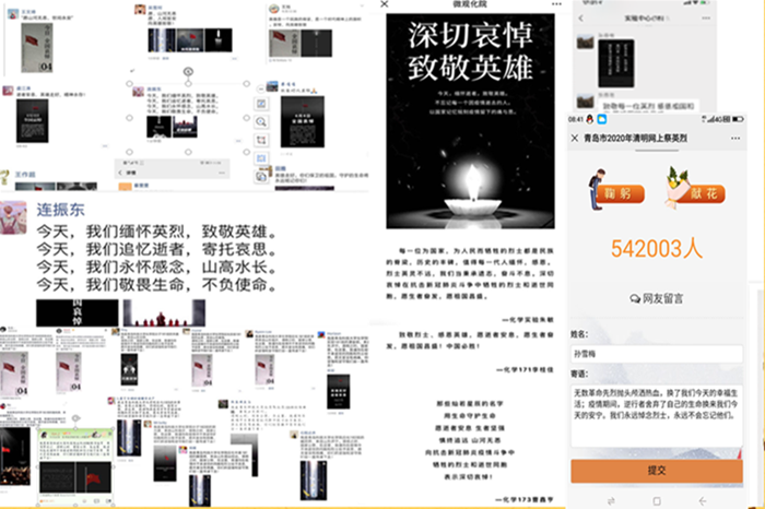 公司通过公司公众号“微观化院”和易班等媒体平台发出倡议,号召全院师生向革命先烈致敬,表达对祖国的祝福。愿英雄安息,生者奋发;愿山河无恙,世间皆安。来自湖北的化学实验181班的董玲玲说,“感谢抗疫英雄们用铮铮铁骨为我们换来世界的光彩依旧,惟有奋发成才报效国家,才是对他门最好的缅怀。”