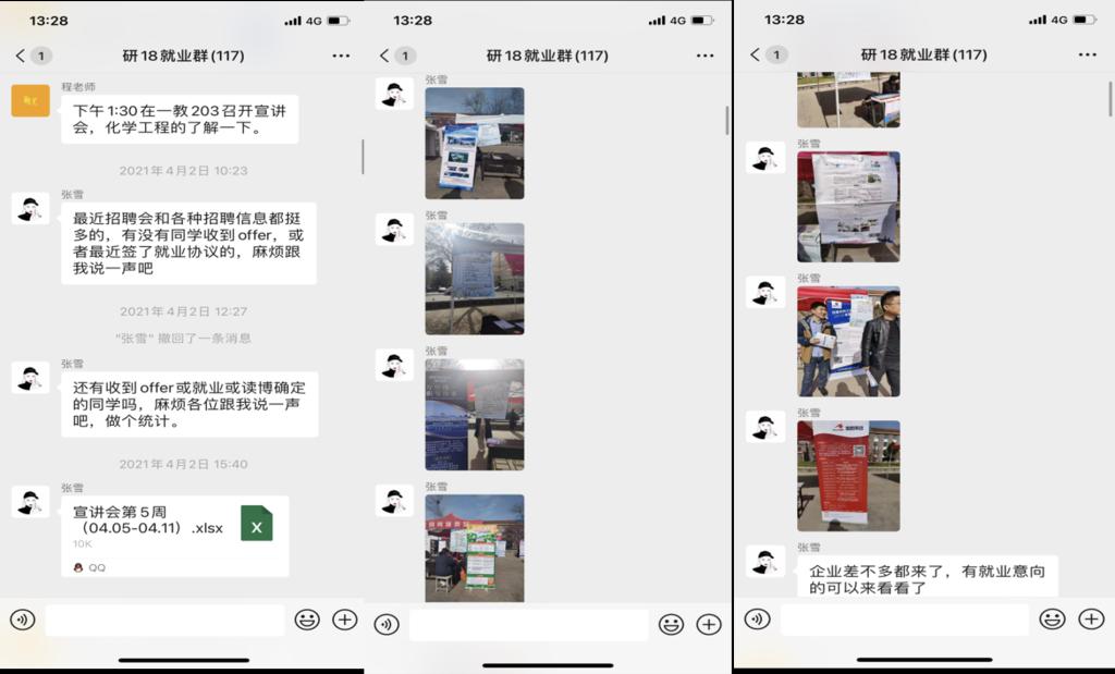 化学就业助理张雪(党员)建立了就业考试群和企业就业群,推送相关考试招聘信息108条、相关就业信息154条。党员李志远、王一盟等员工干部及时整理转发就业信息,给予同学就业意见。其余党员同志在保证自身就业的基础上,主动关注身边同学的就业情况,积极把企业招聘信息推荐给未就业的同学。