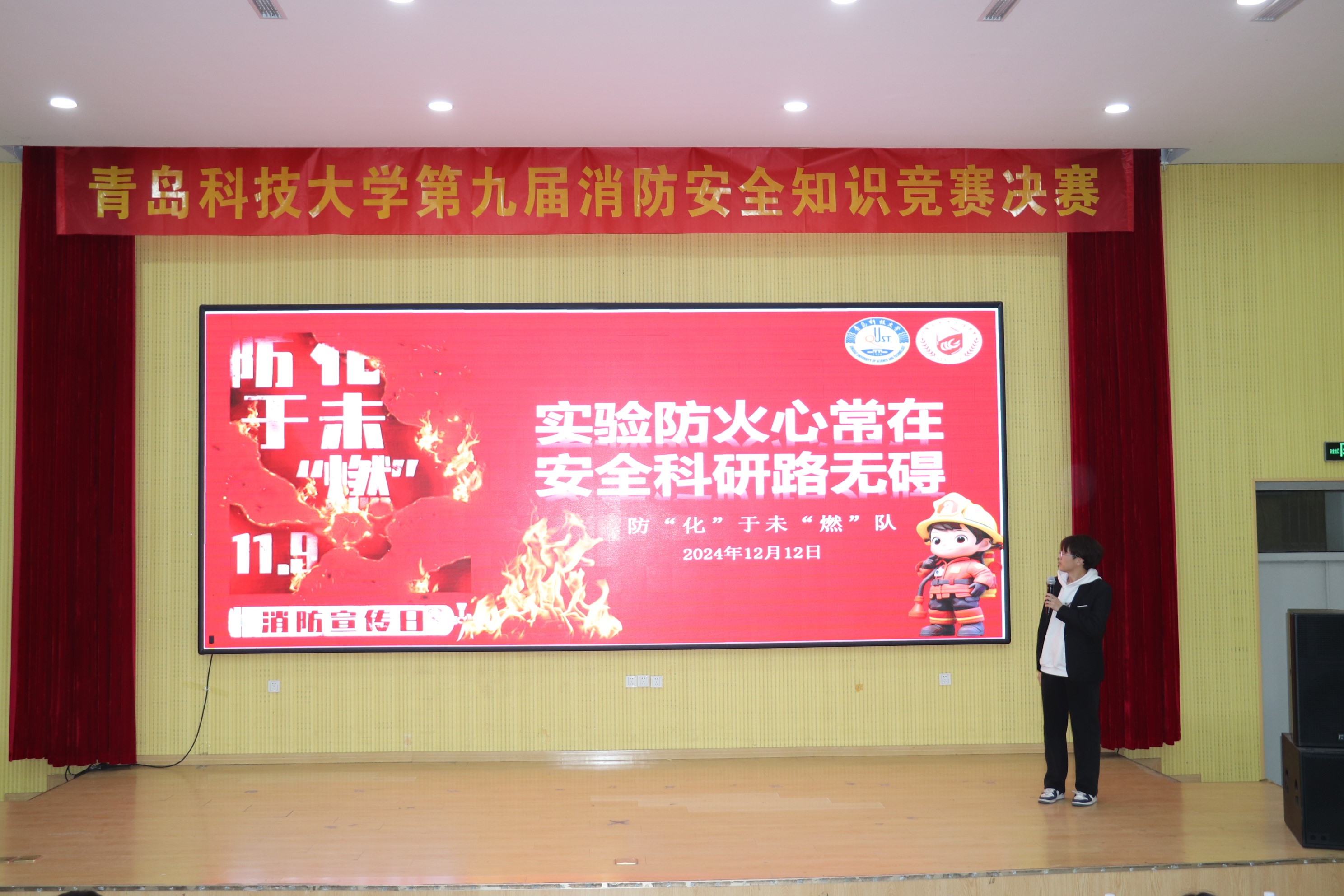 比赛现场,w66利来旗舰厅的选手们全情投入,各个环节表现精彩纷呈。主题演讲环节,孙友浩仪态大方、言辞恳切,以“实验防火心常在,安全科研路无碍”为演讲主题,结合校园实验室中的真实消防案例,深入浅出地阐述消防安全的重要性,用生动的语言呼吁大家提高警惕,防患于未“燃”,出色的演讲功底与沉稳的台风瞬间抓住了全场观众与评委的目光,为团队优秀表现奠定了坚实基调。