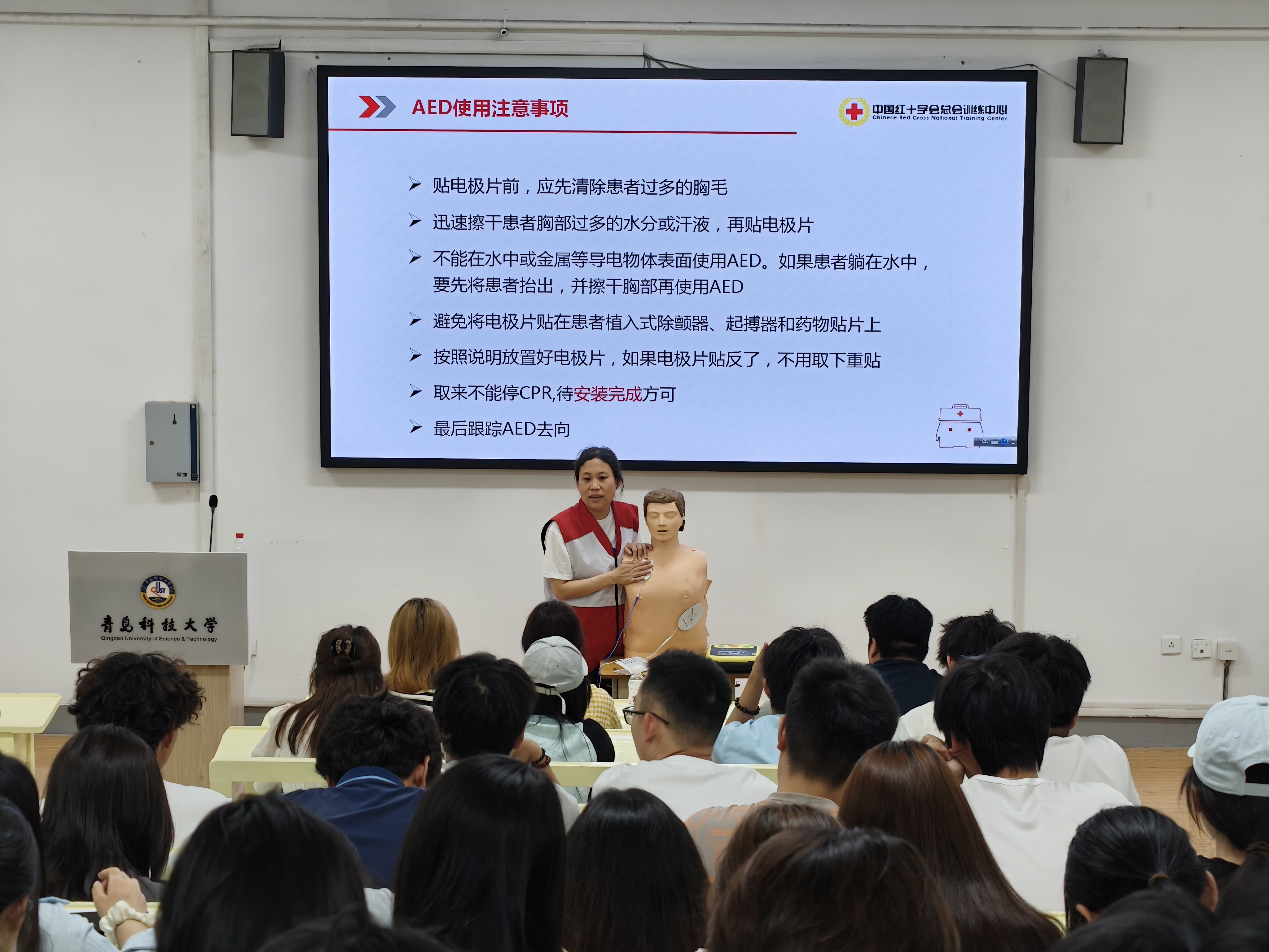 为提升广大师生应急救护能力,普及“黄金四分钟”急救理念,让救命设备AED(自动体外除颤器)真正发挥守护生命的关键作用,6月3日w66旗舰厅官网化学与分子工程学院联合青岛市市北区双山社区邀请青岛市红十字会专业人员,在四方校区一政234举行AED急救培训。