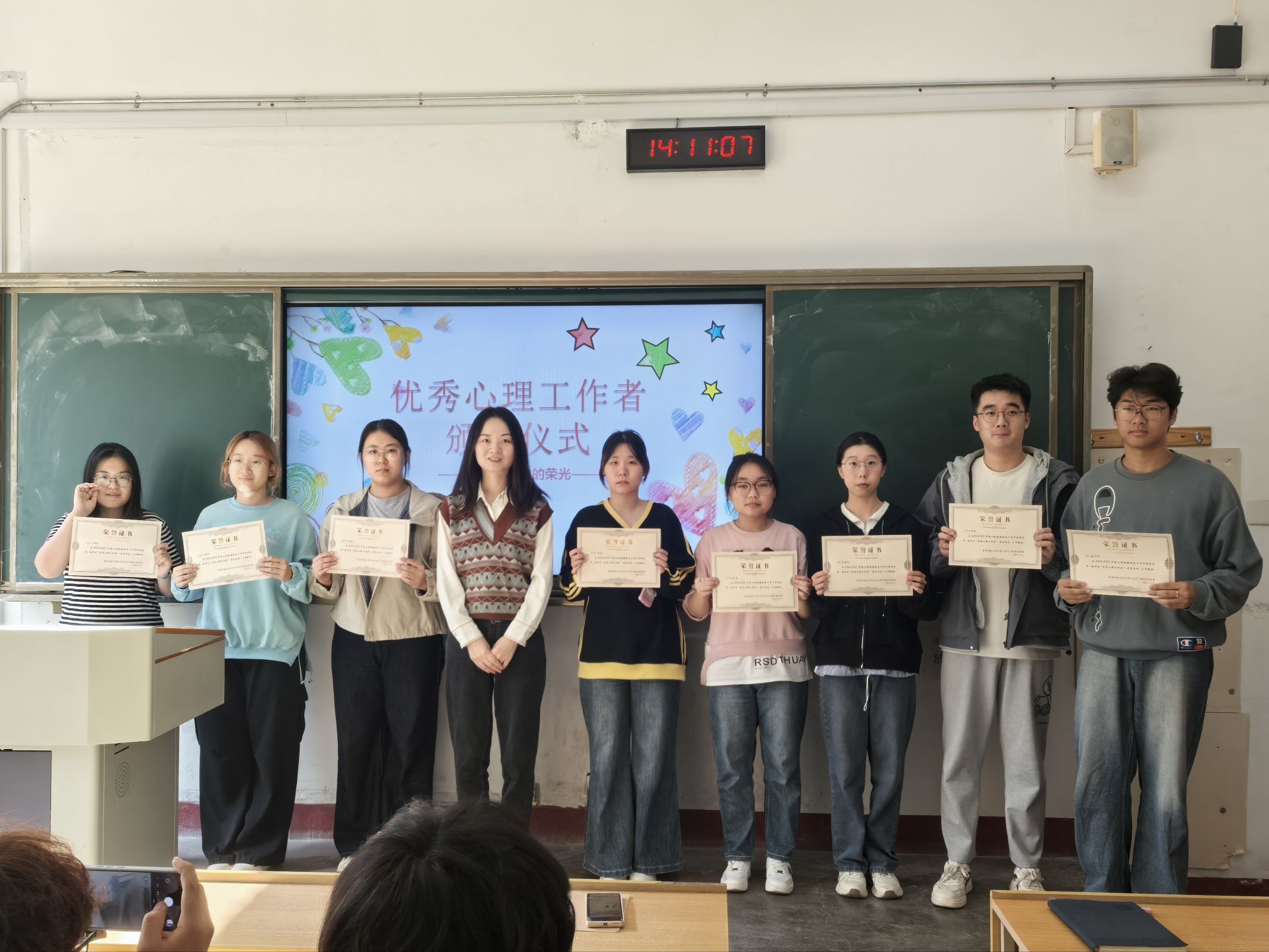 马晓风老师为2024-2025学年度公司 “优秀心理工作者”颁发证书,表彰他们在心理服务工作中的积极贡献,同时也为新成员树立了学习榜样。