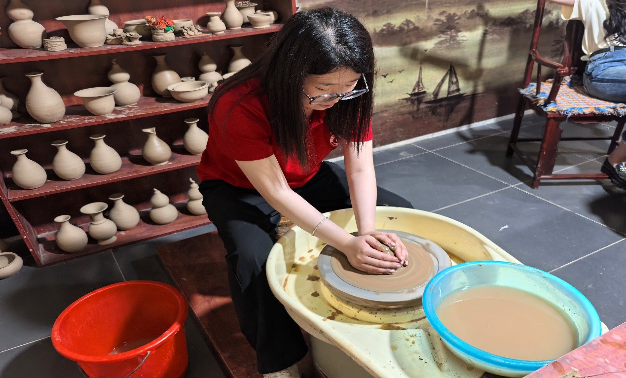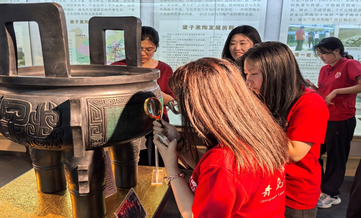 团队首访德州博物馆,通过“历史长卷”展厅的系统陈列,队员们梳理从史前至近代的德州文明发展脉络,在珍贵文物与历史史料中感悟地域文化的深厚积淀与中华文明的连续不息。随后,团队走进梁子黑陶博物馆,深入探究国家级非遗黑陶制作技艺。在传承人的讲解与指导下,队员们亲手体验拉坯塑形,并了解到烧制过程中温度控制的化学原理,直观感受到古老技艺蕴含的科学智慧与匠心精神。