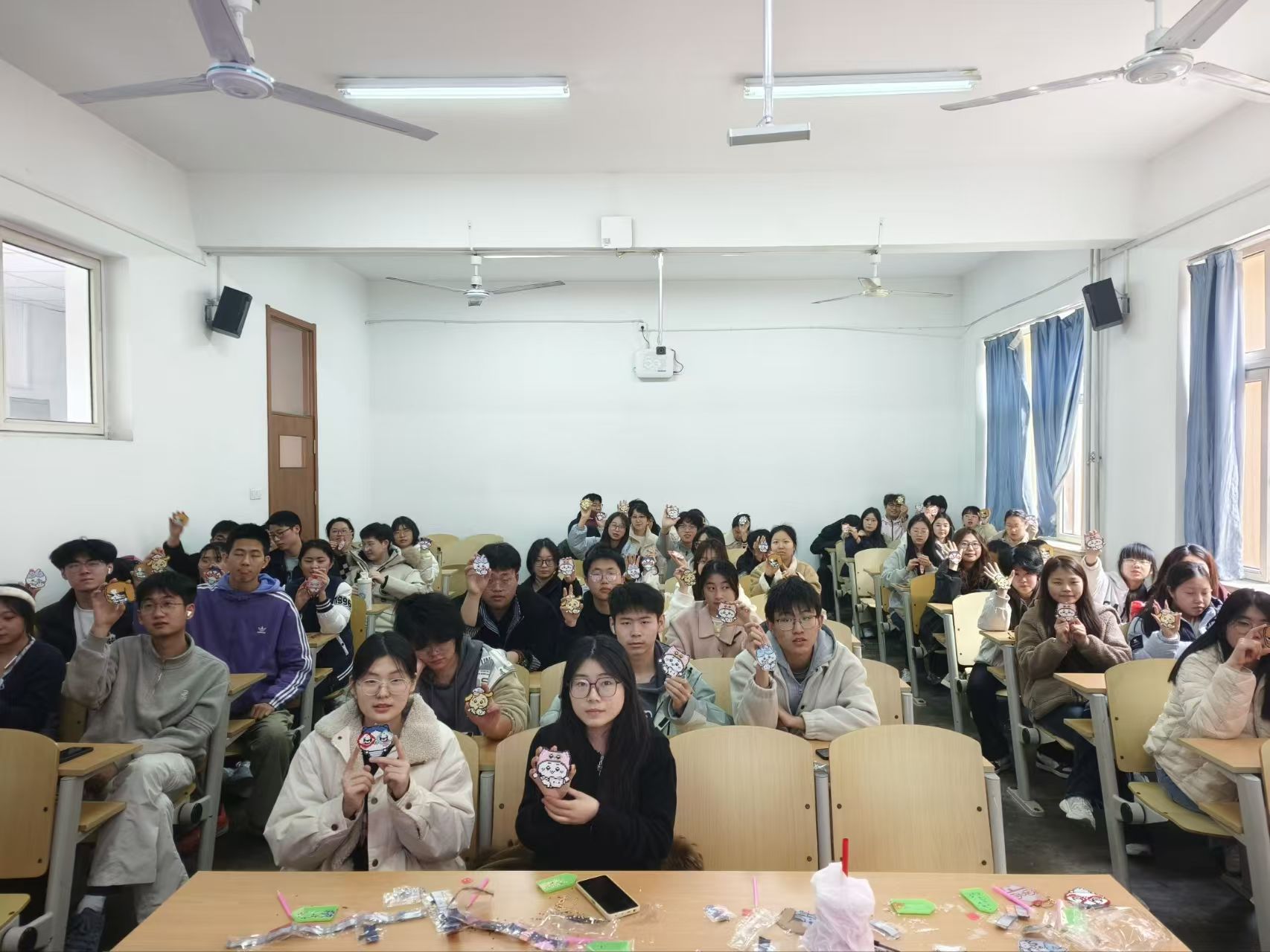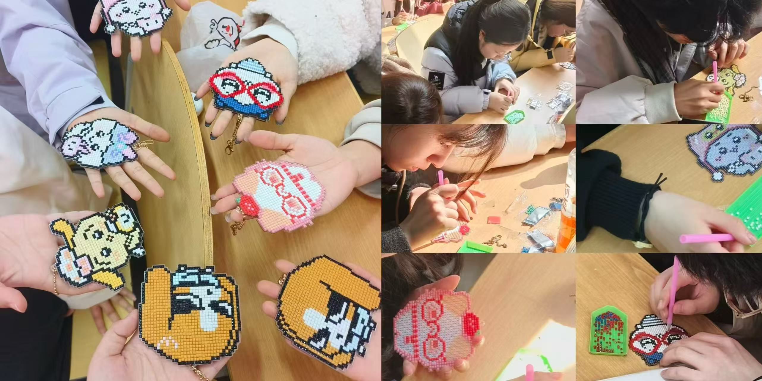 活动开始之际,主持人向同学们介绍了本次活动的初衷与意义,强调“善爱我”不仅是善待自己、接纳自我,更是在陪伴中相互温暖、在协作中共同成长。活动过程中,工作人员将钻石画创作与化学原理深度结合,层层拆解亚克力树脂的分子特性、胶水分子与钻面间的范德华力与氢键粘合原理,以及从散点到网格的组装逻辑。同学们三人一组协作制作钻石画钥匙扣,如同分子联结成稳定结构般彼此支撑,在专注点钻的耐心沉淀里,慢慢抚平情绪褶皱,收获手作带来的成就感与松弛感,又传递了接纳不完美、耐心沉淀、自我调节的心理健康理念。