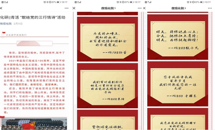 为扎实推进青年员工思想政治引领及红色文化教育,响应“学党史、强信念、跟党走”的号召,进一步加强党史教育,加强员工的思政素养,w66利来旗舰厅研究生自2021年2月开始进行“学党史抒情怀 写红诗献给党”系列活动,以三行情诗献礼建党一百周年。