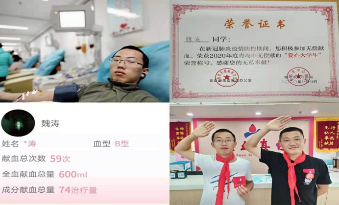 w66利来旗舰厅研182班的魏涛在高考后完成了人生中第一次献血,从此开启了无偿献血的公益行为。截至2021年4月,他累计献血59次,全血献血总量600 mL,成分献血总量共74治疗量;本科期间,加入了w66旗舰厅官网红十字会,多次参加青岛市中心血站参观交流活动,进行无偿献血的宣传工作,并积极参加“无偿献血车进校园”的志愿活动;于2015年3月1日进行了第一次长达40分钟的血小板1个治疗量的捐献;2016年进行了骨髓造血干细胞的留样并顺利加入中国骨髓库,以实际行动为五湖四海的朋友贡献爱心。2020年,他收到了青岛市无偿献血荣誉卡,并获得2020年度青岛市无偿献血“爱心老员工”荣誉称号;2021年,他收到了全国无偿献血奉献奖金,切实感受到了党和国家对无偿献血志愿者的关心,也进一步加强了“无偿献血,拯救生命”的信念。