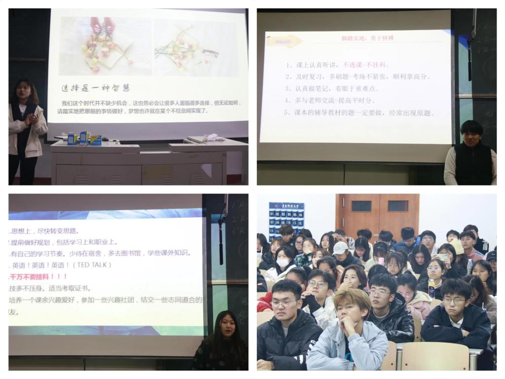 活动开始,优秀的学长学姐们上台分享自己的经验。在分享过程中,郭静静、丛源都提到了科研经历对本专业学习以及保研的重要性,鼓励21级员工主动联系老师进入实验室,对本专业有更深刻的了解。同时,郑德波、李婉婷也提到了日常学习积累的重要性,建议同学们树立明确的目标,加强自己的时间管理,提高学习效率,重视平日的每一节课。刘德洋介绍了学科竞赛的相关内容,分享了自己的比赛经验,激励大家对学习保持热爱,坚持前行。除了学习方面,张敏还给出了“学会选择,学会创造,学会感恩,学会放手,无论何时都要逆风翻盘、向阳而生”的人生建议,对21级员工有很大的启发。薄禄薇从“明德惟馨,笃学不倦,弘毅求远,拓新求实”四个方向给出了同学们关于学习、工作、生活、社会实践等方面的周全的建议。在活动过程中,同学们认真听讲,积极发言,及时地提出了自己的困惑,也得到了学长学姐的热情解答。正如老话所说,“榜样的力量是无穷的”,相信在学长学姐的示范下,21级员工定能树立明确目标,为自己将来的学习生活做好规划,在今后的学习生活中取得优异成绩。