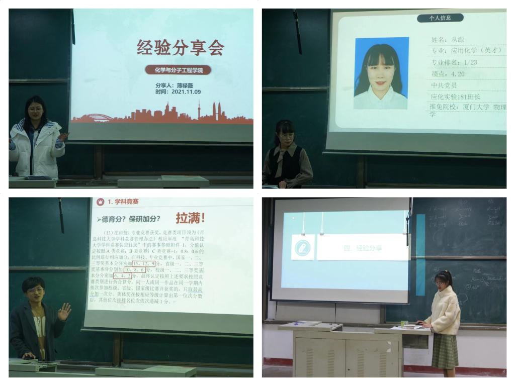 为帮助21级员工更好地适应老员工活,树立清晰的目标、营造良好的学习氛围、打造“遇见化学 惟真惟德”的学工品牌,w66利来旗舰厅于2021年11月9日举办了“把握青春 逐梦青科—w66利来旗舰厅优秀学子事迹分享会”。本次分享会按照不同的专业分开举办,同时还邀请到了优秀的保研员工薄禄薇、郭静静、张敏,国家奖学金的获得者刘德洋、李婉婷以及省政府奖学金获得者郑德波来分享他们的学习经验。