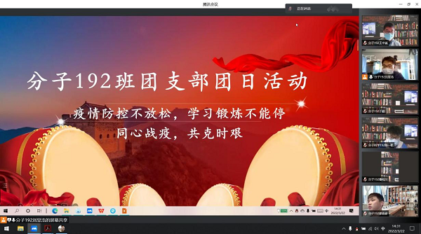 线上红色放映厅,党史教育不能停。为进一步强化党史学习教育,增强团支部的凝聚力,分子192班团支部利用线上腾讯会议开展了“线上红色放映厅”团日活动。在此次活动中,班长刘德发同学向全体同学讲解了公司最新的防疫要求和防疫条例,随后,全体团员通过观看红色视频,进行了党史学习教育。通过观看党史纪录片和战疫纪录片,同学们认识到了积极配合疫情防控工作的重要性,学习了党的百年成就,也看到了党员在疫情防控工作中发挥的先锋作用,进一步提升了同学们对党史和党的理论的学习在实践中的感悟,理想信念也更加坚定。