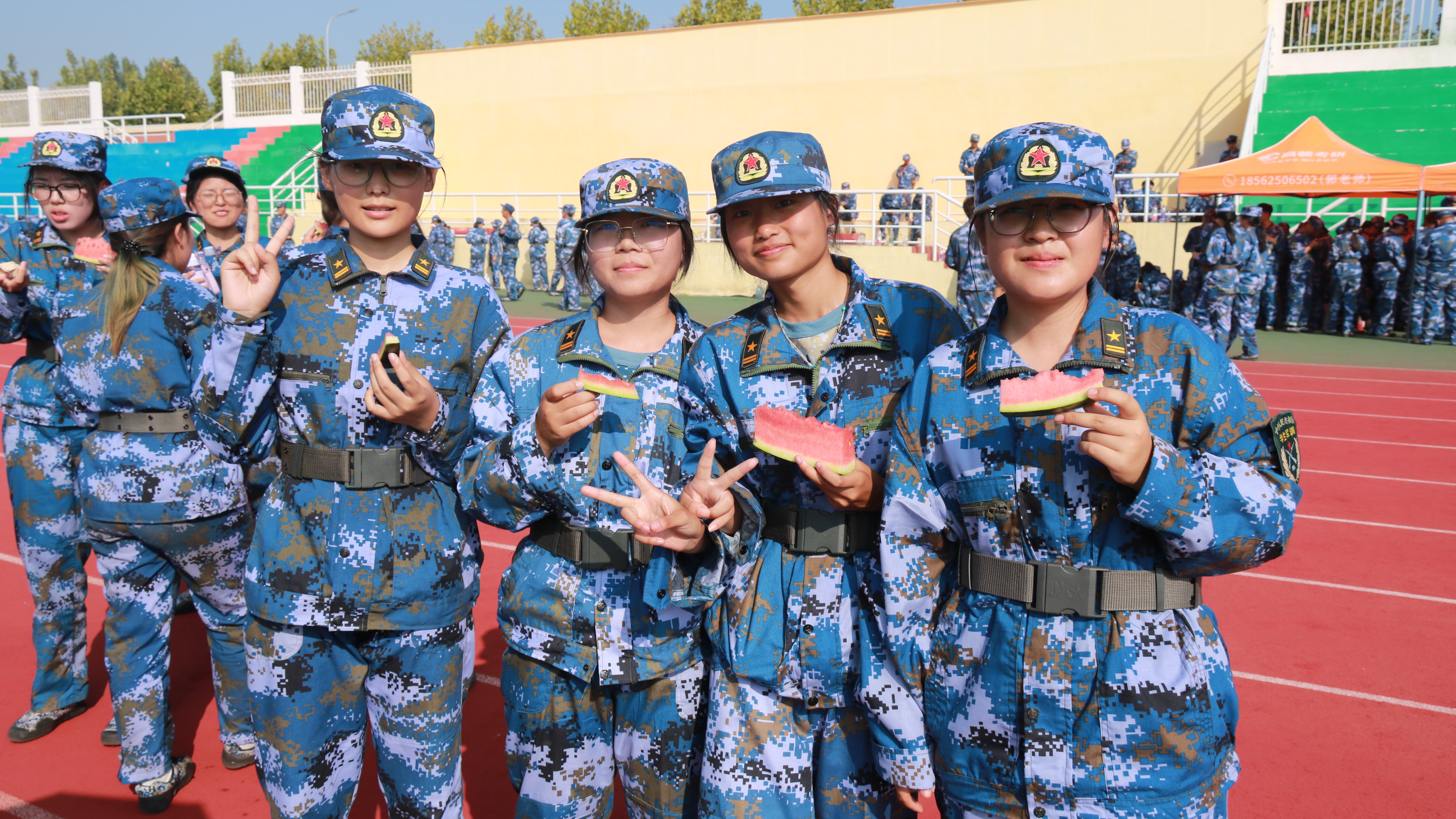 训练时的疲惫、燥热、辛苦,在班助们带来的西瓜和关心中得到缓解,烈日、微风、西瓜,关心、愉悦、惊喜,组成了这天下午最青春、最美丽的一幅画,闲聊时与同伴聊聊梦想,休息时望向远方,眼中满是对新生活的向往。