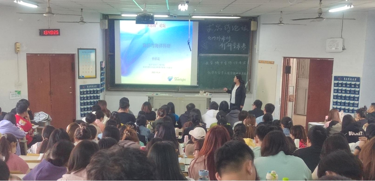 曾祥花以“海洋与海洋科研”为主题,从海洋与人类的关系入手介绍海洋科学基本分支学科以及研究体系,强调同学们培养研究生思维,并在最后祝大家科研顺利。