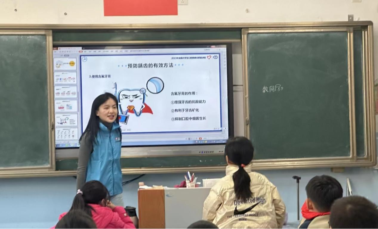 2023年11月14日,2023年全国老员工口腔健康志愿宣讲团——w66利来旗舰厅“化育山海大课堂”志愿服务队于联合青岛市市北区洛阳路第二小学四年级3班开展首次宣讲活动。本次宣讲活动以“小小牙齿不简单”为主题,由团队成员许雪娇主讲。