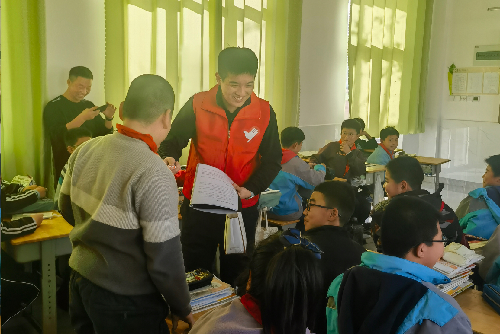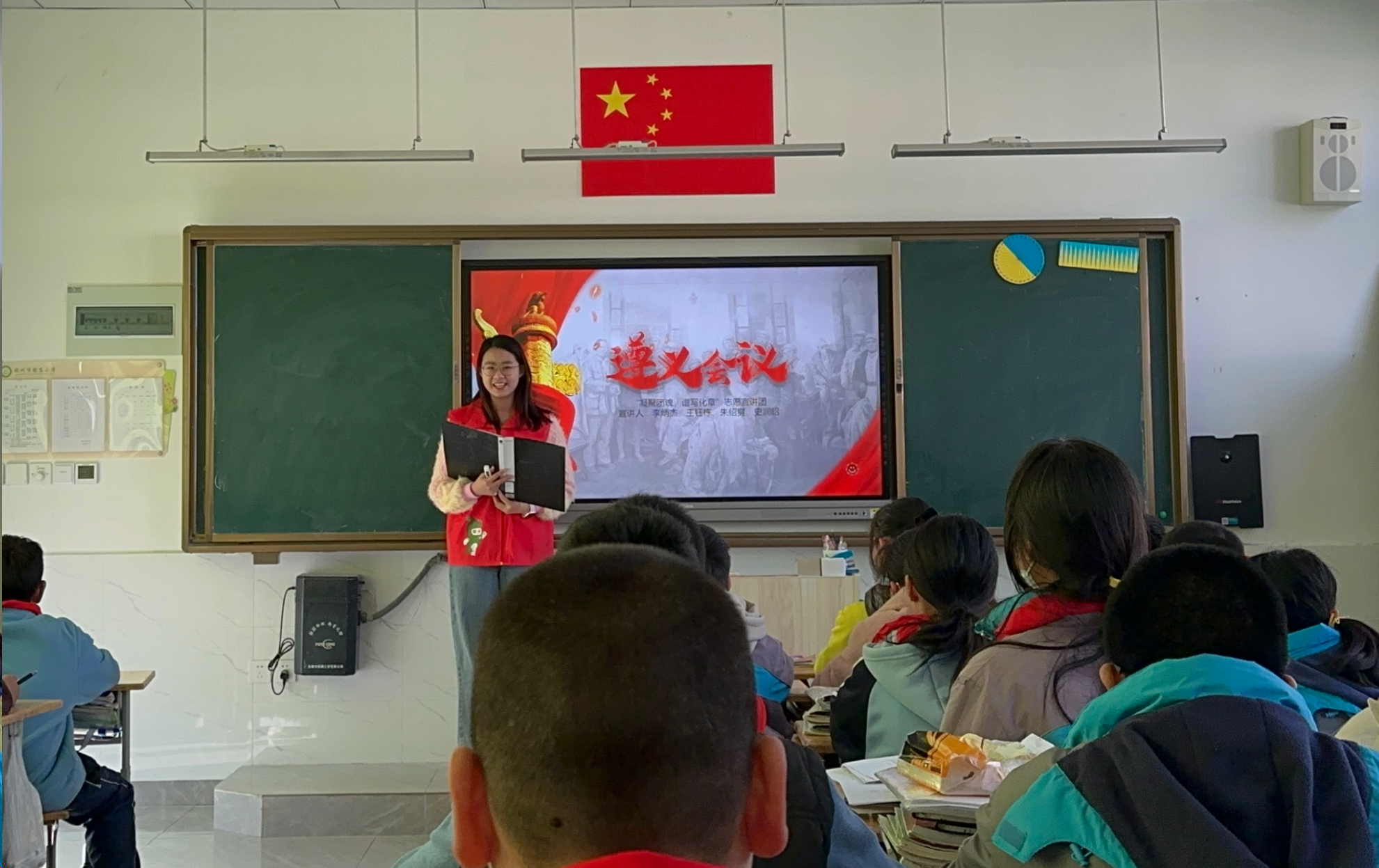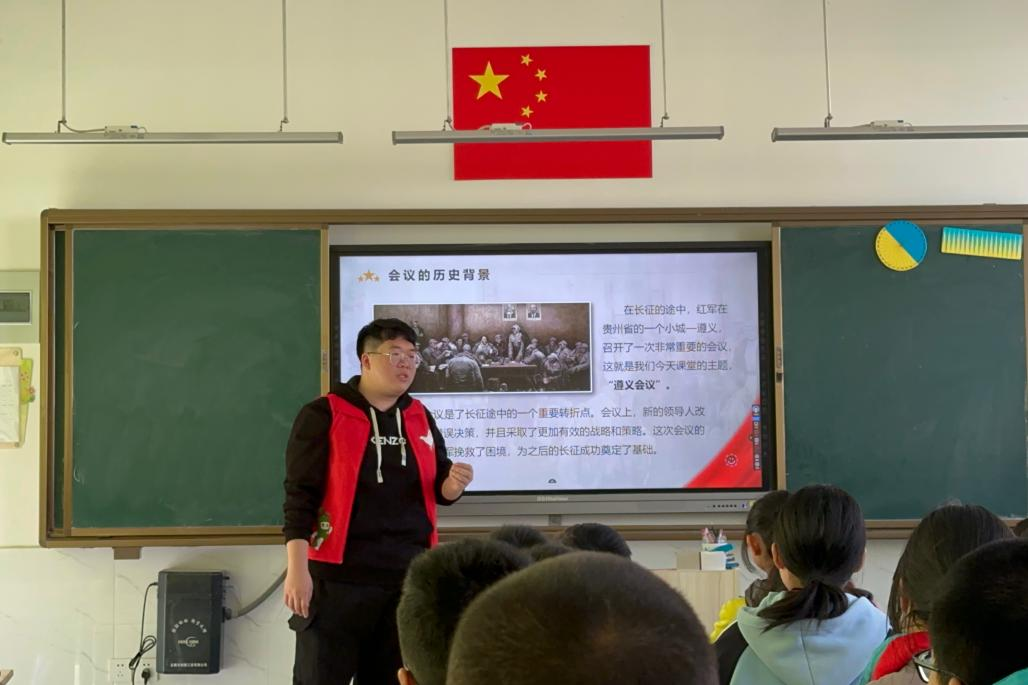 为深入学习宣传贯彻党的二十大精神以及习近平总书记关于青年工作和社区治理的重要论述,深入贯彻落实习近平总书记提出的“传承红色基因、讲好遵义故事”的重要要求,引导中小员工弘扬遵义会议精神,赓续红色血脉,努力成长为担当民族复兴大任的时代新人。12月6日,w66利来旗舰厅遵义会议精神“凝聚团魂,谱写化章”志愿宣讲团走进胶东村胶东小学六年级1班,开展以“坚定信念,不忘初心”为主题的遵义会议精神宣讲。